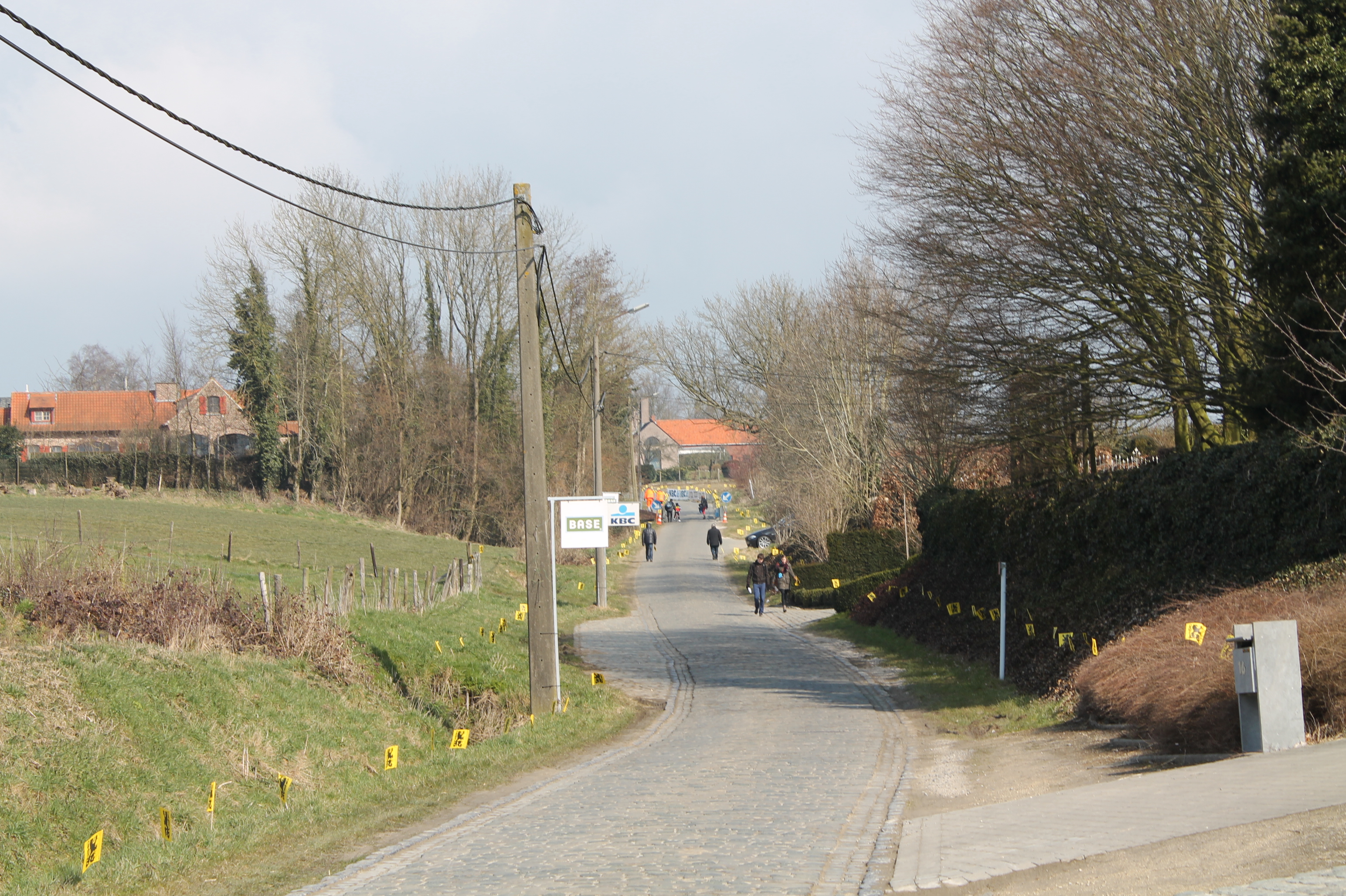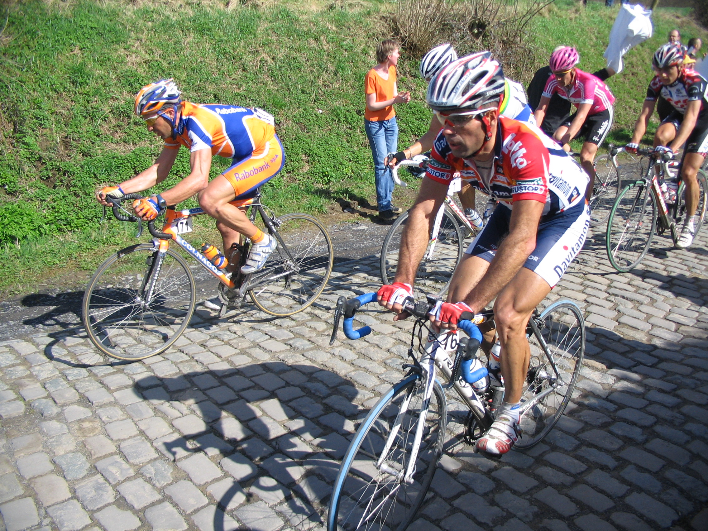 Hier stonden we op Het Foreest nabij Schorisse. Deze helling werd in de geschiedenis van de Ronde van Vlaanderen maar vier keer beklommen: van 2003 tot 2006. Op de foto zit de Nederlandse kampioen van toen, Erik Dekker, op de kop van het peloton. Hij werd in 2001 tweede in de RVV. De renner van Quick Step achteraan links is Tom Boonen. Hij won hier voor het eerst de Ronde van Vlaanderen. Achter Boonen, dus de meest rechtse renner van T-Mobile is de bekende Duitse renner Erik Zabel.
