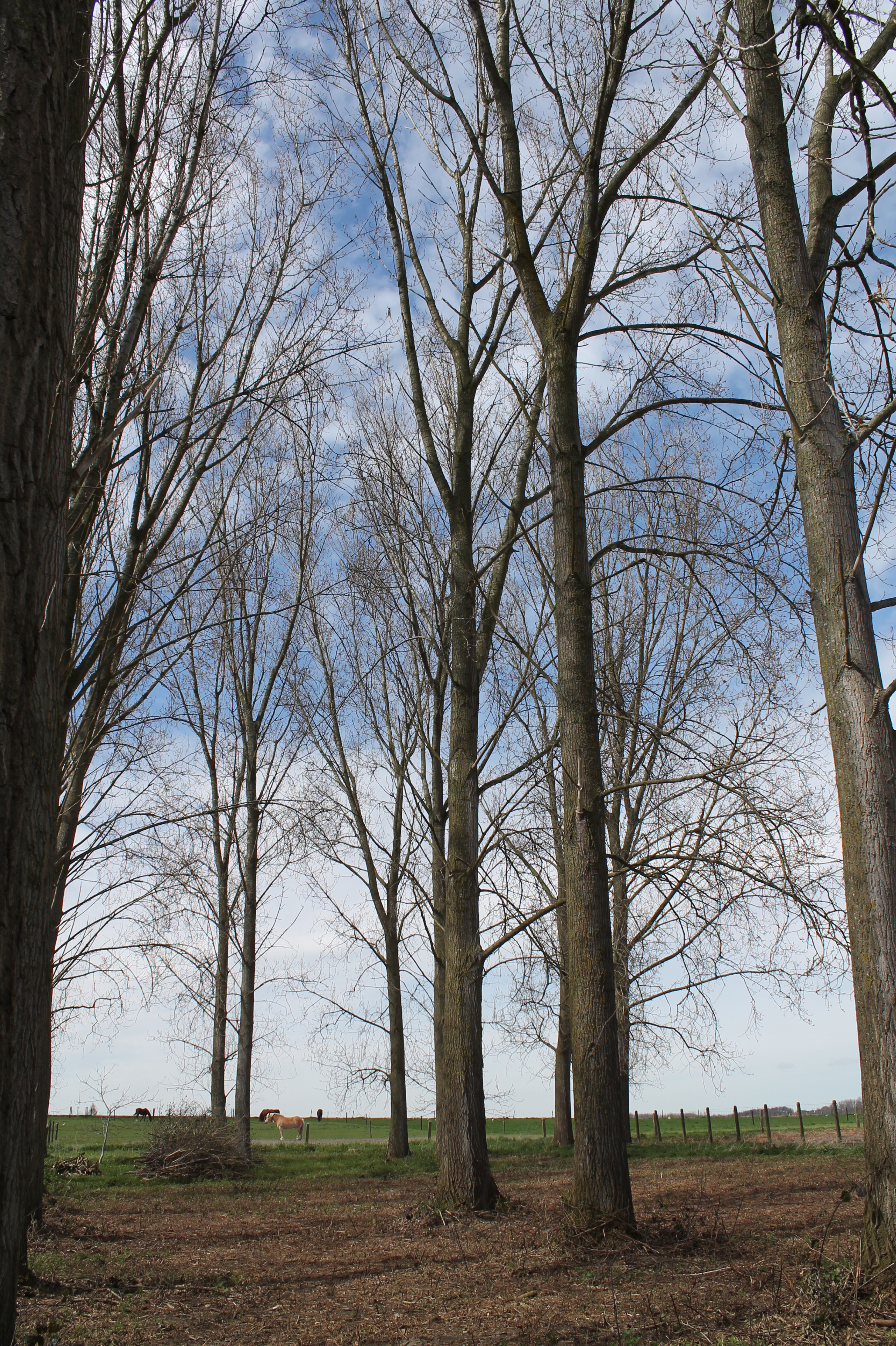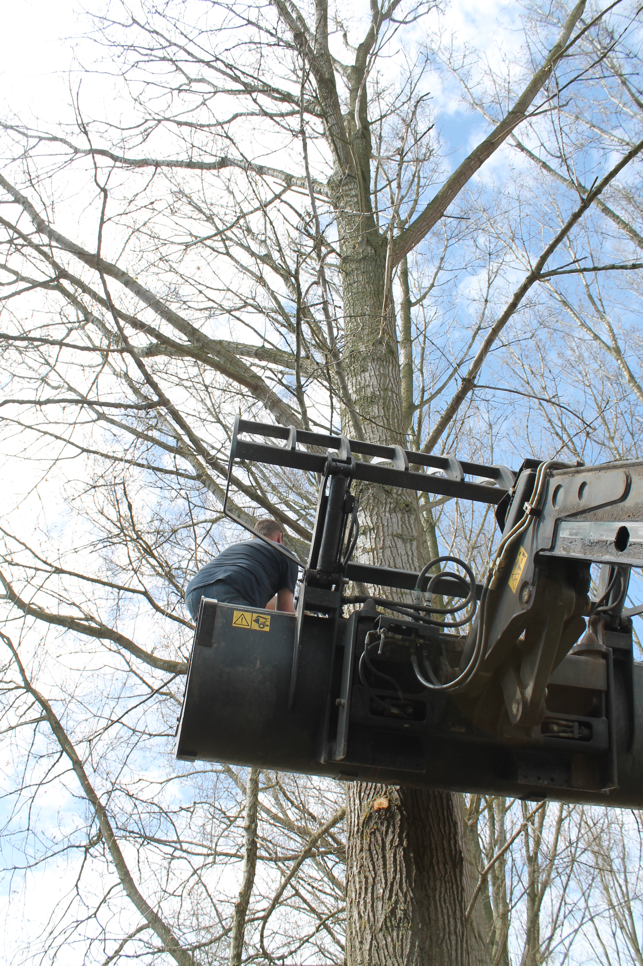Takken of bomen afzagen is echt helemaal papa zijn ding. Je zou zijn “groot blad” eens moeten zien – waar ik jammer genoeg geen foto van heb. Hij doet niet liever dan zagen en hij mag geen enkele tak missen, tot zo hoog mogelijk, dat het proper is. Ik steek hem aan een boom omhoog met de verreiker: eerst zodat hij aan de lage takken kan en dan alsmaar omhoog, tot het niet hoger kan. Papa zit daar boven in de bak van de verreiker nog op z’n tenen te staan om toch zo hoog mogelijk takken mee te hebben. Maar het resultaat mag er zeker zijn: de stammen zijn proper, er kan veel licht door en er kan onder gereden worden met de tractor wanneer het nodig is.