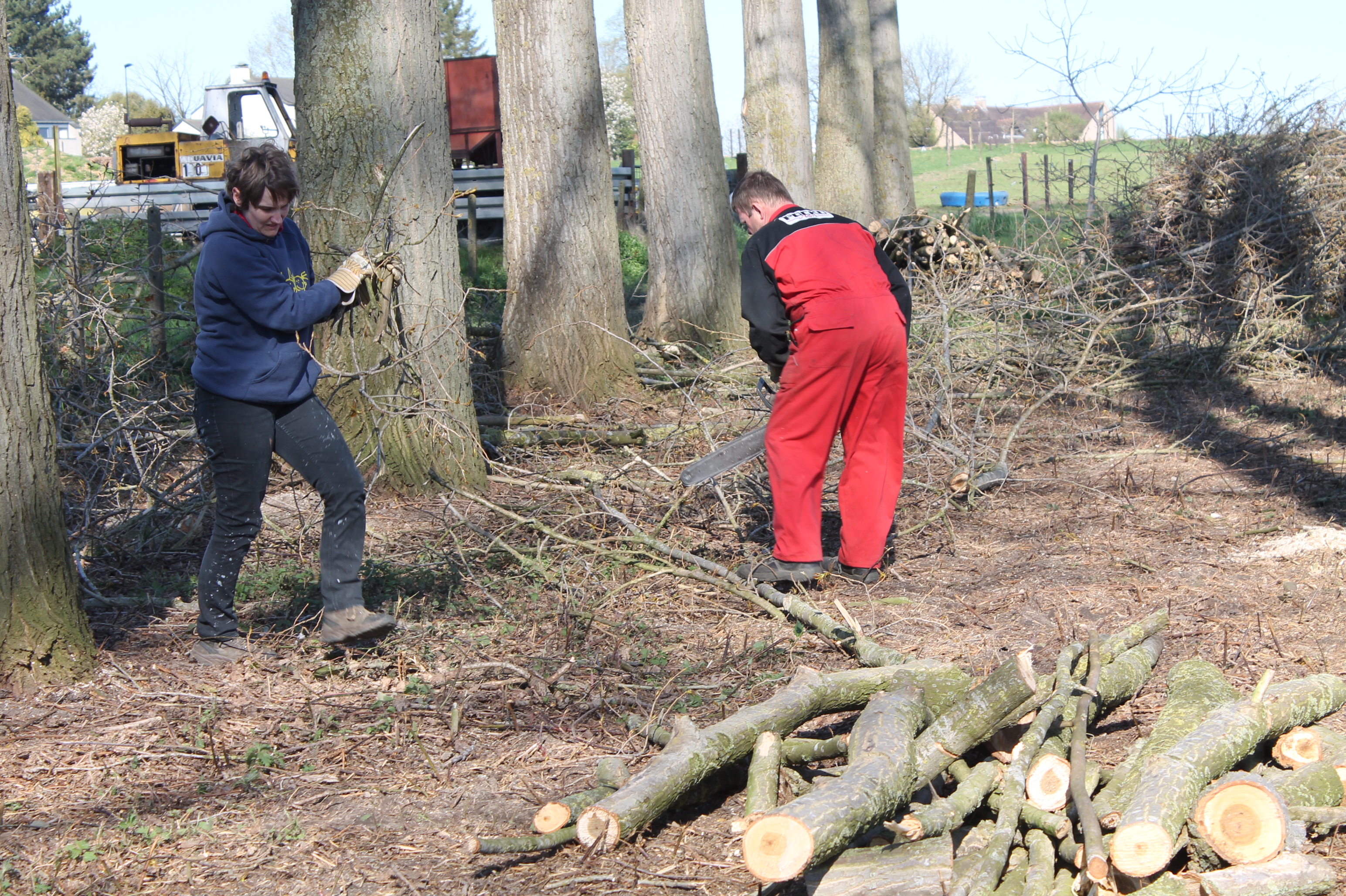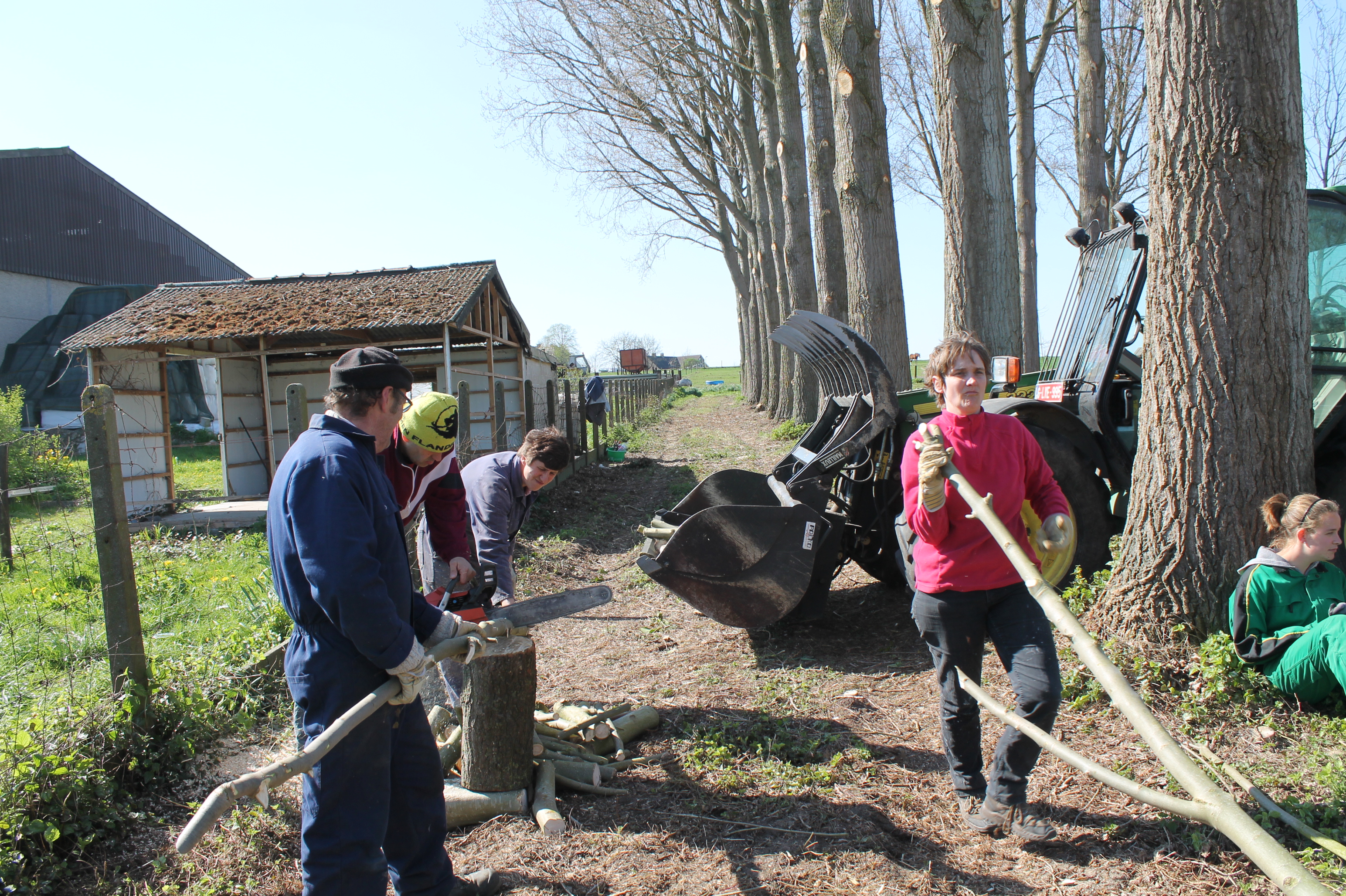 Wanneer de takken dan op de grond liggen, worden die opgekuist: het fijnste wordt eraf gezaagd zodat een mooie tak over blijft. Dit wordt ook door papa gedaan maar daarnaast zijn mama, zus Stefanie en nonkel Raf ook fervente zagers, houtzagers om precies te zijn. De mooie, bruikbare takken worden bij elkaar gelegd en ook van die “fijne, kleine brol” of dus van het houtafval maken we hoopjes. Dit is dan weer het werk van de overige houtgekke familieleden. Zeker wanneer we een boom omleggen, is het toch fijn om met veel te zijn. Ik doe dit taakje graag: je ziet het veranderen, je ziet het verschil door je inspanningen.