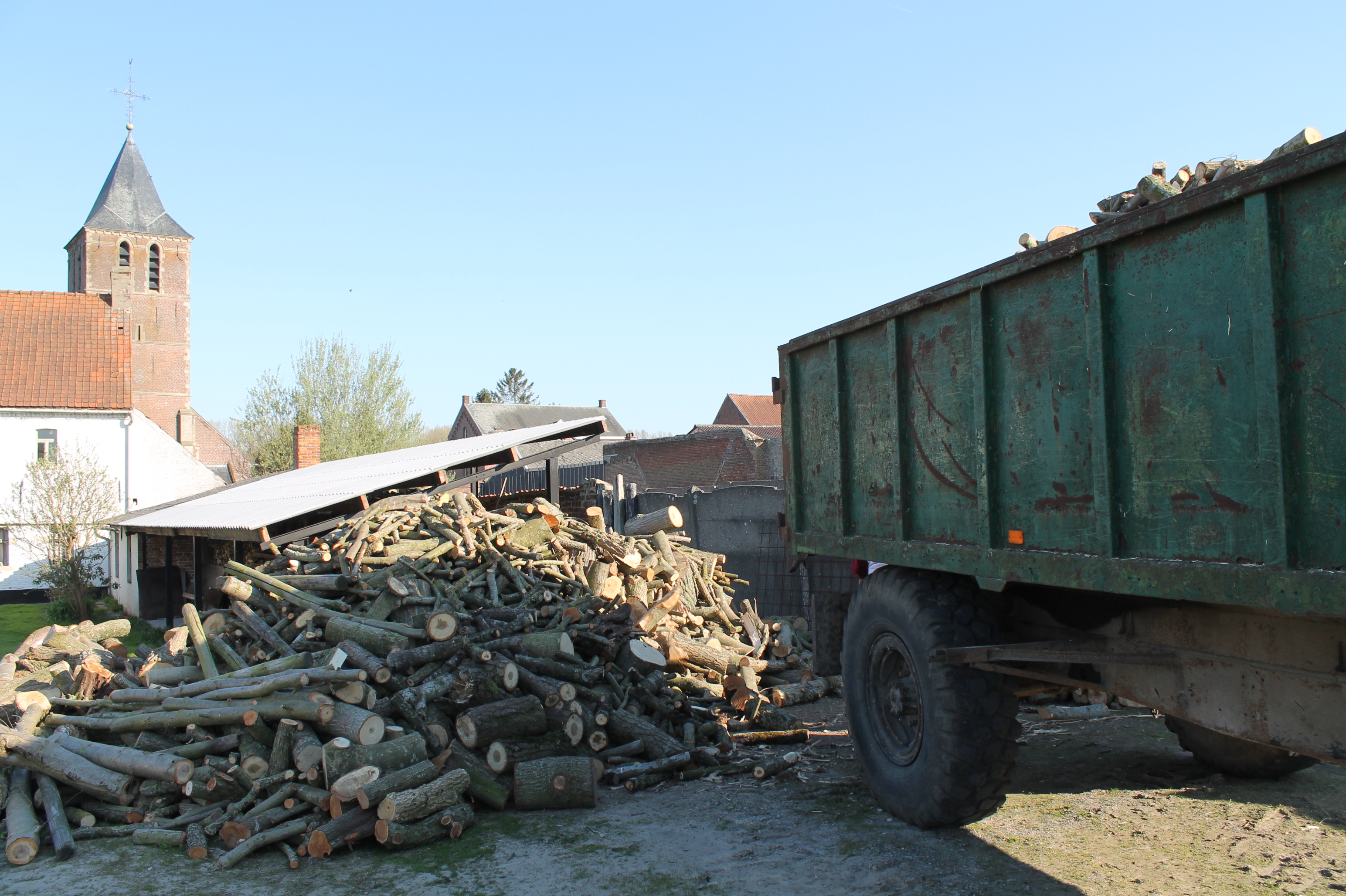 Het houtafval kan verbrand of versnipperd worden. Afgelopen zaterdag huurden we een houtversnipperaar om een hele hoop houtafval klein te krijgen. Met z’n allen een voor een takken in de versnipperaar duwen om die dan in houtsnippers er zien uit te komen op de kar. Die houtsnippers gaan we onder andere gebruiken om omheen onze boompjes van ons groenscherm te doen. Het uiteindelijke resultaat van ons groenscherm heb ik jullie dus nog altijd tegoed.