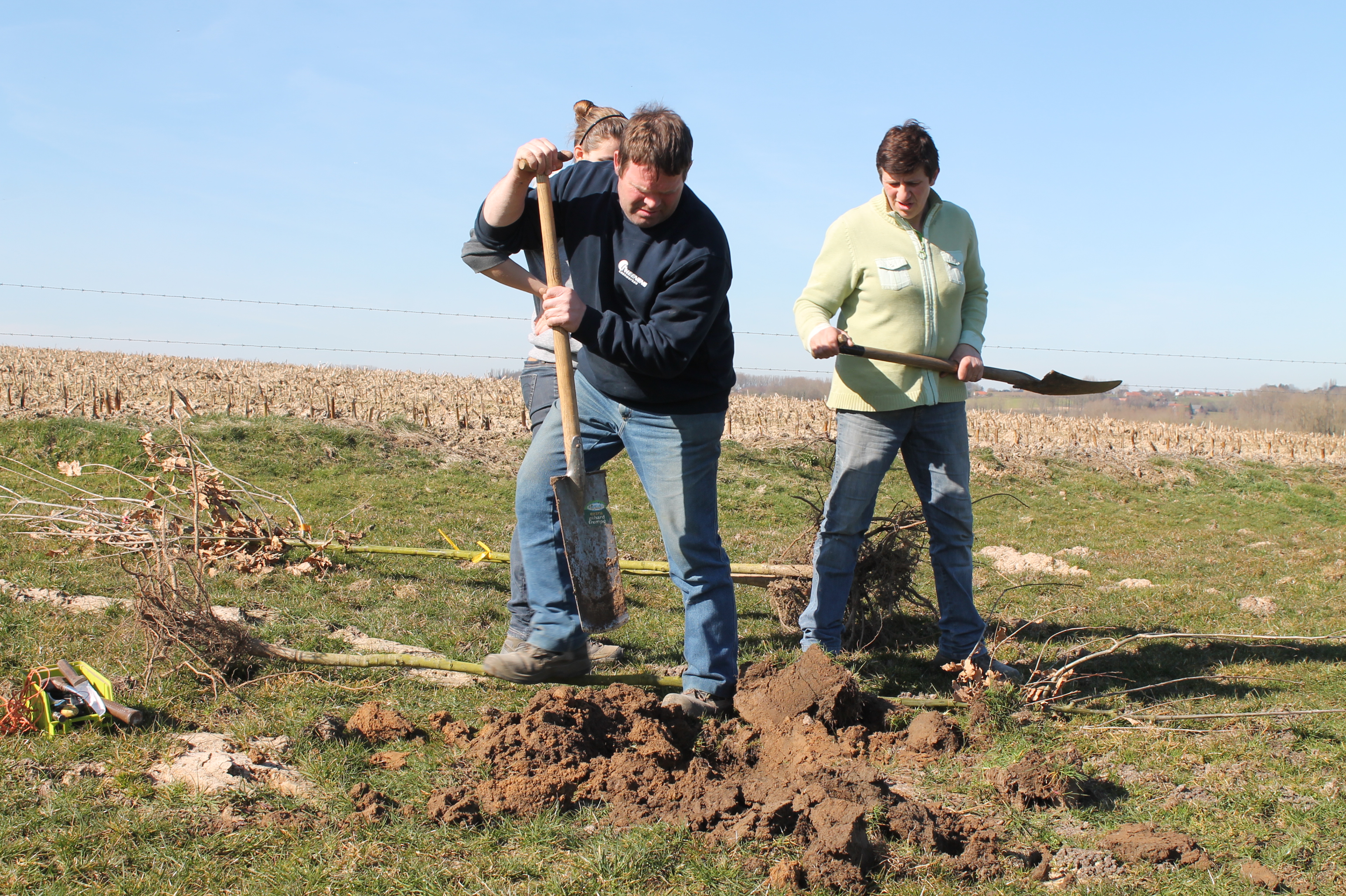 Alle bomen hebben we op 10 meter van de zijkant geplant en telkens ook met 10 meter tussen. Op deze manier kunnen we met de tractor er nog tussen rijden indien dit nodig is. Het is ook belangrijk dat de bomen groot en breed kunnen uitgroeien, zonder gebrek aan licht of ruimte, wat met 10 meter dus zeker voldoende is.