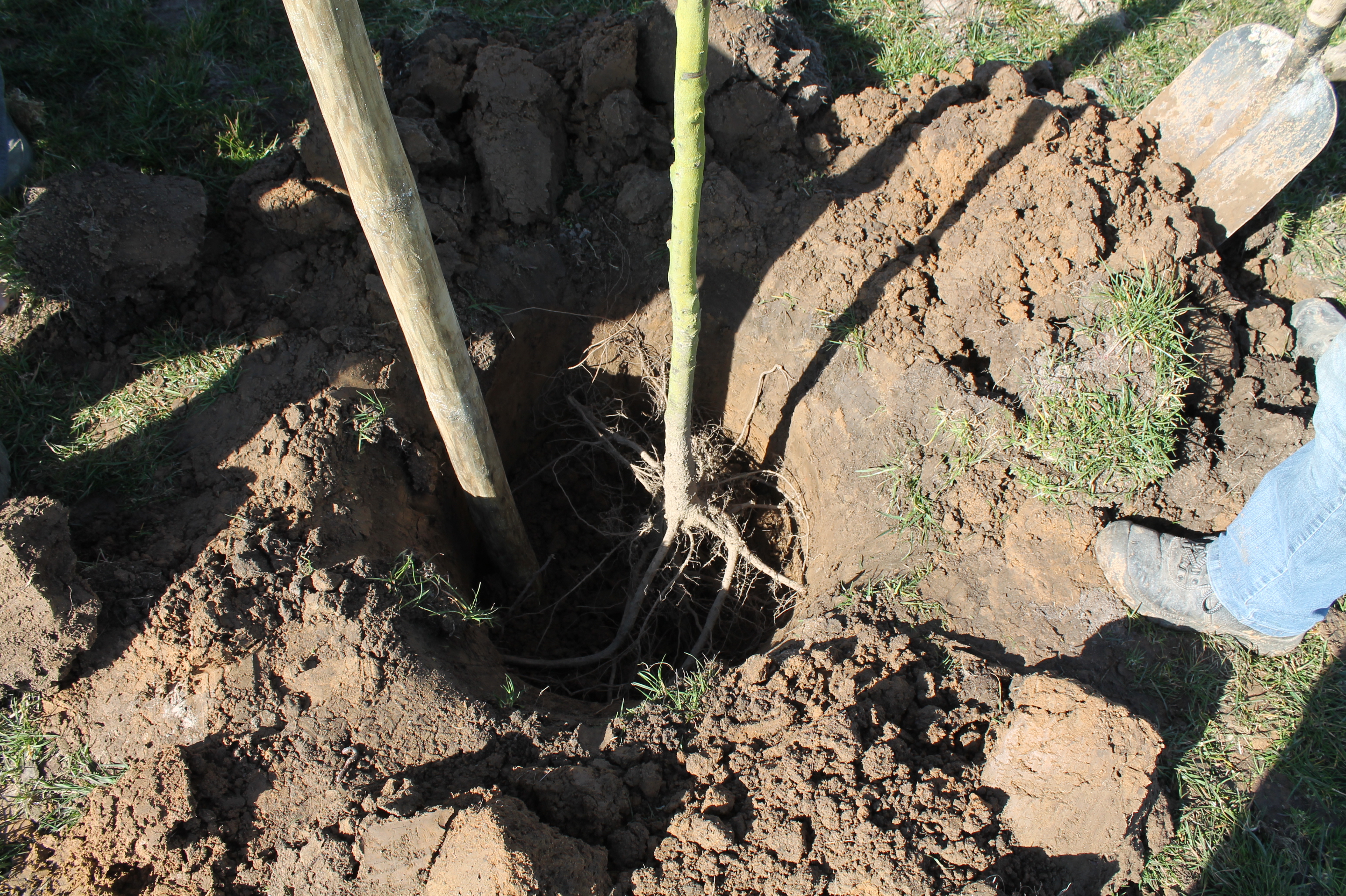 Daarna hebben we met de spade de put nog bijgewerkt zodanig dat die zeker groot genoeg was voor de wortels.