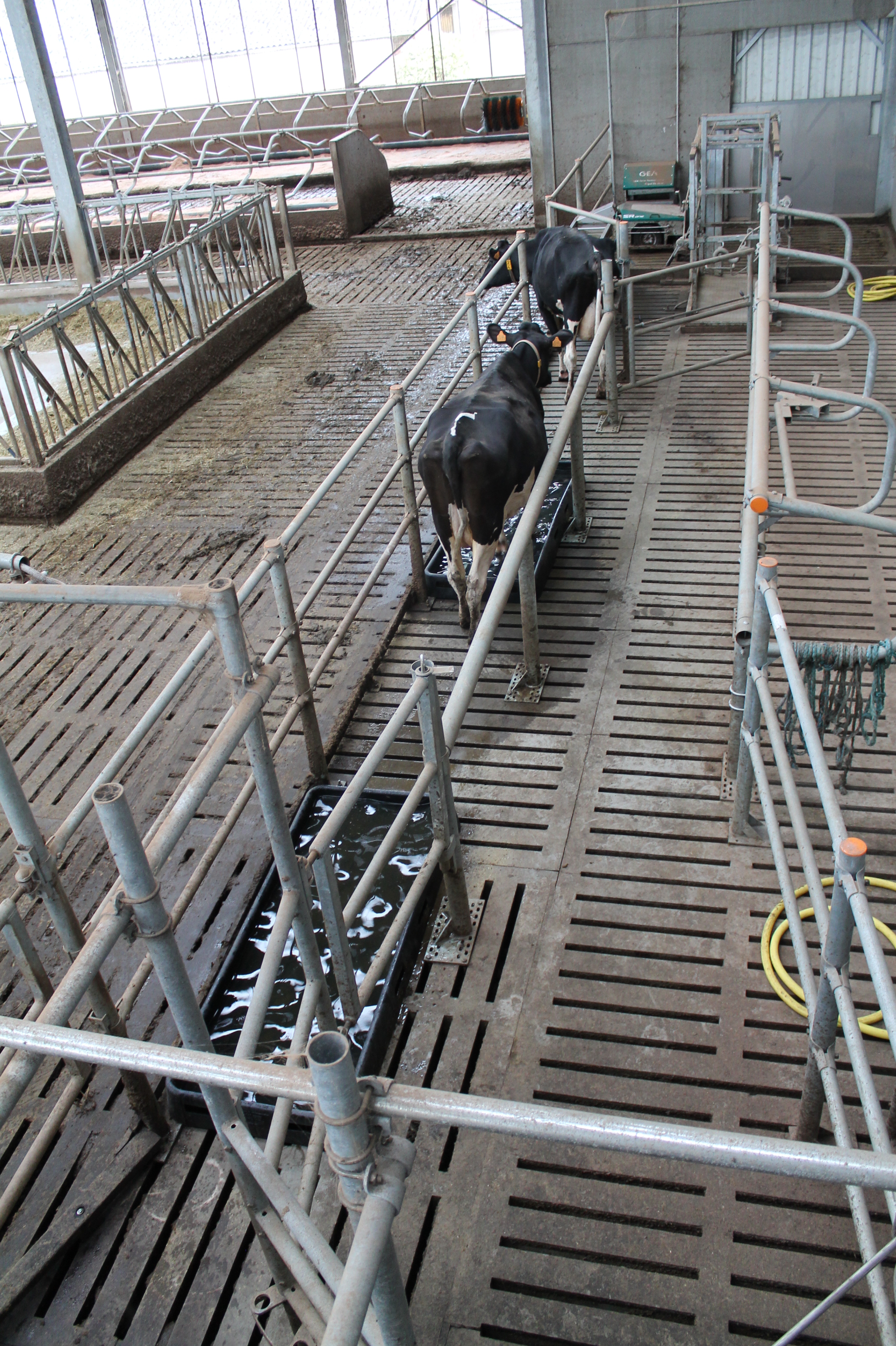 Wanneer de koeien uit de carrousel komen, moeten ze om de twee weken langs een gang met twee voetbaden.