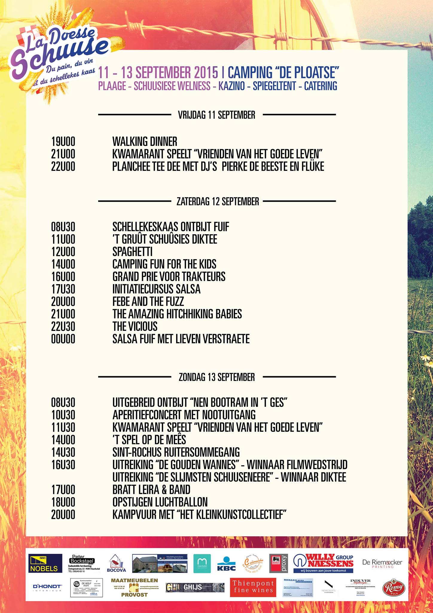 La Doesse Schuuse is van start gegaan! Deze organisatie van Wij Heeren Van Schoorisse wordt zeker en vast een nooit gezien feest in de streek. Zo goed als alle activiteiten vinden plaats op Camping De Ploatse, gelegen op de Zottegemstraat. Dit terrein kan eigenlijk beschreven worden als festivalweide. Bedoeling is om de vakantie nog een beetje te verlengen én dat dichtbij huis. In Schorisse, dat zonder het altijd goed te beseffen, zo veel moois te bieden heeft.