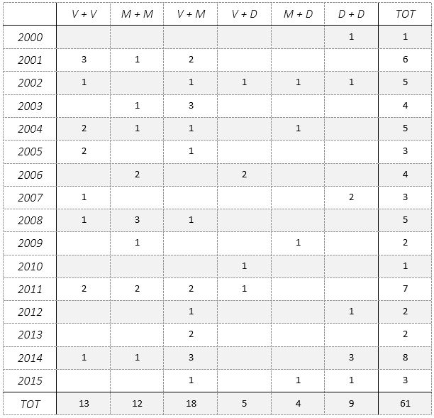 Ik ben terug gegaan tot 2000 en van toen tot nu zijn er in totaal, echt waar, welgeteld 61 tweelingen geboren! Dat is een gemiddelde van 61 : 16 = 3,8125 of bijna 4 tweelingen per jaar. Het “topjaar” was vorig jaar: 8 tweelingen waarvan 1 met twee vrouwelijke kalveren, 1 met twee mannelijke, 3 met een vrouwelijk en mannelijk kalf en 3 waarvan beide kalveren dood werden geboren. In 2011 werden er ook veel tweelingen geboren, namelijk 7. De jaren met de minste tweelingen waren 2000 en 2010: slechts 1. Het volledige overzicht heb ik in een tabel gezet. Zo kunnen alle cijfers en totalen duidelijk getoond worden.