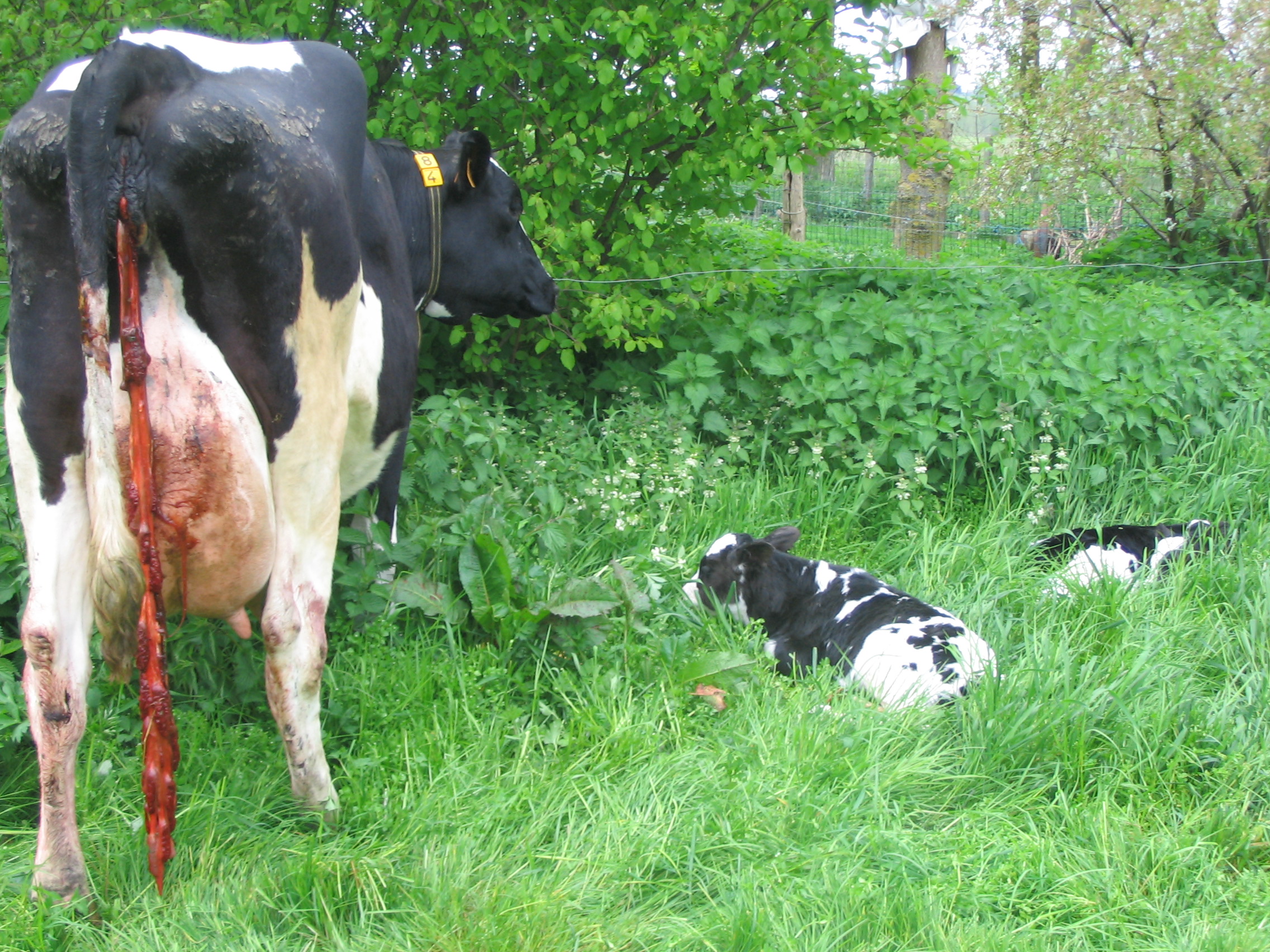 Op bovenstaande foto zien jullie Holly en Jacinta met hun mama. Ze werden, zoals jullie zien, buiten op de weide geboren, op een kleine weide naast onze stal waar toen op kalven staande koeien verbleven. Wat ook opvalt aan deze foto, en daarom koos ik deze, is de nageboorte die aan het afkomen is. Hierover schreef ik evenals eerder een blogbericht.