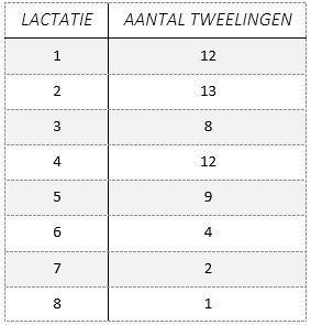 Vanaf de zesde lactatie wel minder aantallen maar dat komt ook gewoon omdat er minder koeien zes lactaties halen. Wanneer ik dan echt preciezer keek naar welke precies in hun eerste en welke precies in bijvoorbeeld hun vijfde of zesde kalfden, dan zag ik wel dat het bij degenen die al in hun eerste lactatie kalven vaak in de familie zit, terwijl dat bij oudere en dus hoogproductievere koeien vaak niet het geval is. Dus het klopt inderdaad wel, zoals ik al had gehoord, dat hoogproductieve koeien vaker tweelingen geven.