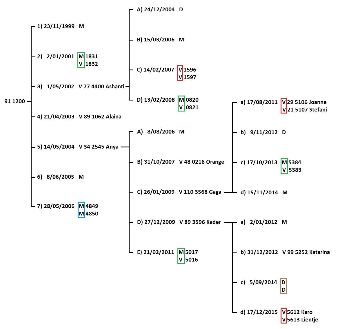 UPDATE De zotte tweelingfamilie werd op 17 december 2015 nog een tweeling rijker. Kader, een dochter van Anya en dus kleindochter van 91, kreeg voor het tweede jaar op rij een tweeling. Vorig jaar stierven de kalveren bij de geboorte maar dit jaar heeft ze, met onze hulp, twee mooie en gezonde dochters op de wereld gezet. Ze kregen intussen de naam Karo en Lientje, naar onze veeartse die Kader negen maanden geleden insemineerde.