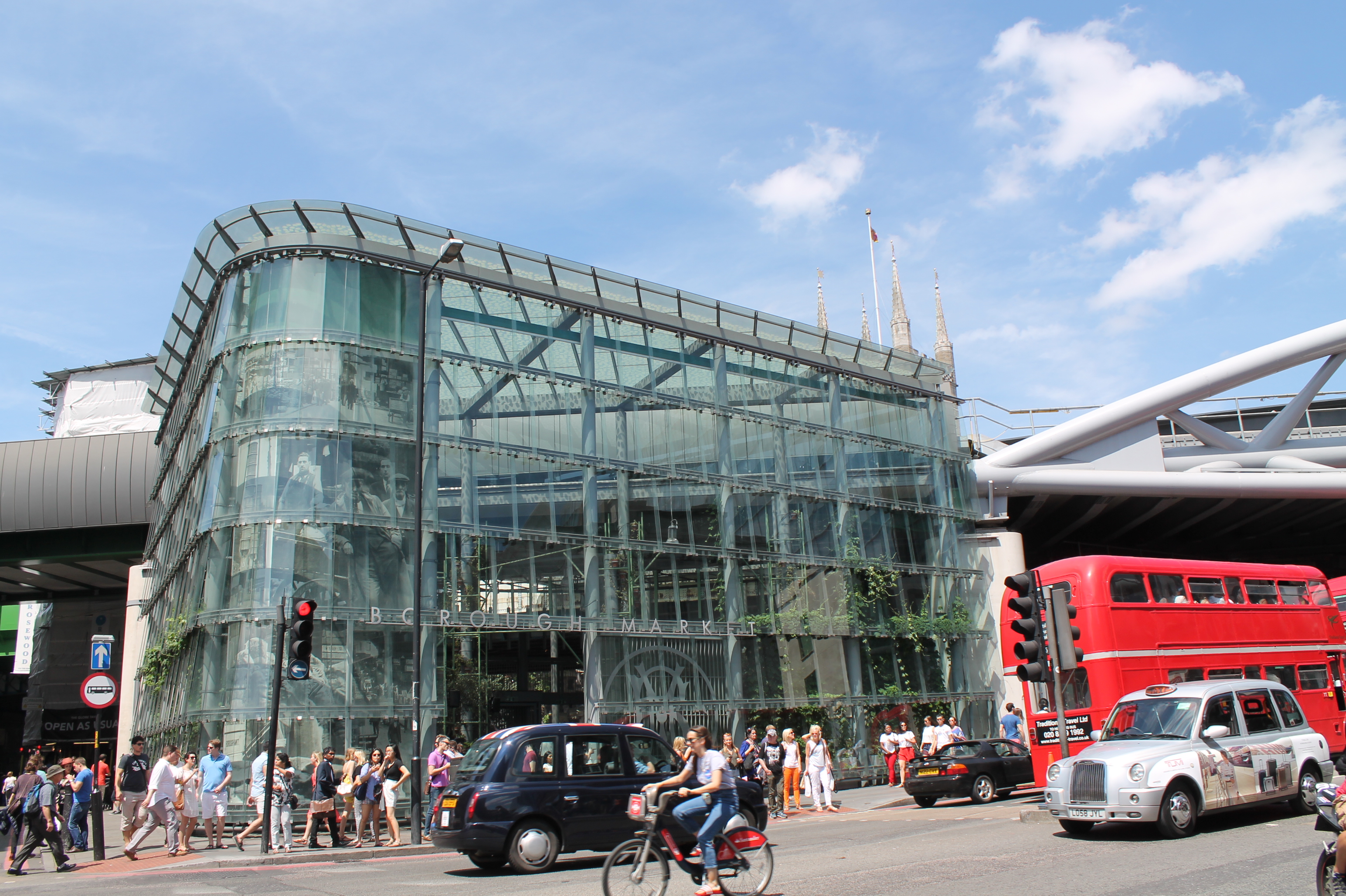 Borough Market is de oudste voedselmarkt van Londen want in 1276 was er al sprake van deze markt. Hij werd wel een paar jaar afgeschaft maar vanaf 1756 werd hij terug gehouden. De huidige gebouwen werden ontworpen in 1851 maar zijn intussen al hier en daar aangepast. De buitenwand op de foto is recent vernieuwd. Er zijn meer dan 150 stalletjes of kraampjes waar heel veel verschillende soorten voedsel wordt verkocht. Sommige bevinden zich onder de treinsporen en dat zorgt voor extra sfeer. De geur, de kleuren, de mensen… Het geheel zorgt voor een aangenaam gevoel. Van woensdag tot zaterdag meestal vanaf 10 u (zaterdag vanaf 8 u) tot 17 u (vrijdag tot 18 u).