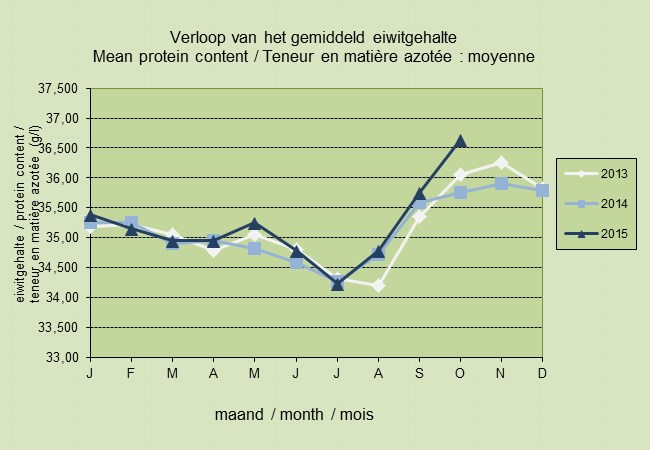 Het jaargemiddelde van alle bedrijven volgens MCC was 35,10. Net als bij het vetgehalte varieert het eiwitgehalte, om dezelfde redenen, maar dit is wel minder duidelijk.