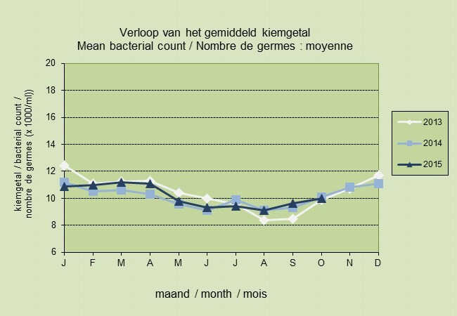 Het kiemgetal duidt het totaal aantal bacteriën aan. Het geeft vooral een aanduiding omtrent de hygiëne want wanneer het kiemgetal hoger is, is dit vaak te wijten aan de reiniging van het melksysteem. Hiermee kregen wij deze maand nog te maken: er was één van de 24 melkstellen niet goed gereinigd omdat we bij het verlaten van de carrousel er blijkbaar per ongeluk moeten tegen gebotst zijn.
