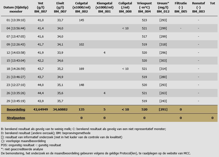 Vijf keer op twee weken wordt de melk uit onze melktank opgehaald. Daarbij wordt telkens een melkmonster genomen dat zal gebruikt worden voor de kwaliteitsbepaling van de melk. Deze bepaling wordt uitgevoerd door Melkcontrolecentrum (MCC) Vlaanderen. De melkveehouder betaalt elke maand een basisbijdrage van 24,06 euro aan MCC Vlaanderen voor deze kwaliteitsbepaling en daarnaast 12,66 euro voor extra analyses voor de kwaliteitspremie. Er worden voor de kwaliteitsbepaling van de melk negen parameters onderzocht, waarvan vijf parameters moeten voldoen aan bepaalde eisen om geen strafpunten en dus afhoudingen te krijgen. Melkveehouders kunnen de resultaten raadplegen op de website van MCC. Hieronder krijgen jullie daarvan een voorbeeld, uit augustus 2014. Daarna beschrijf ik alle parameters, de een heeft al wat meer uitleg nodig dan de andere. Ook wordt dan duidelijk voor welke parameters en vanaf wanneer precies er strafpunten worden toegekend. Na de paramaters wordt het strafpuntensysteem dan uitgeklaard.
