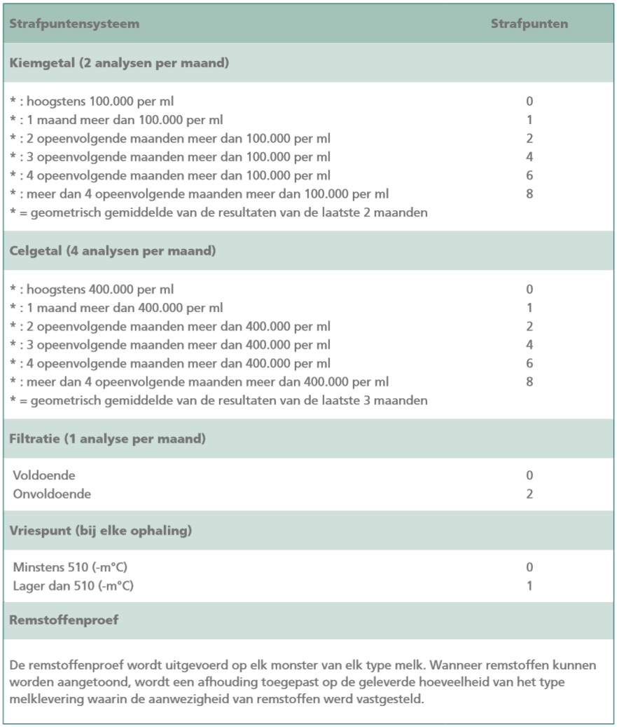 Door de verwittiging is de melkveehouder snel op de hoogte en dan kan hij ook snel de oorzaak van het probleem zoeken. Wanneer er een of een paar keer een slecht resultaat is, zorgt dit meestal nog niet meteen voor een overschrijding van de limiet. Maar wanneer dit wel het geval is, worden er zoals eerder vermeld strafpunten toegediend. Het strafpuntensysteem wordt uitgelegd in de tabel: men ziet hoeveel strafpunten worden toegediend voor elke “overtreding”. Voor elk strafpunt wordt dan bij de maandelijkse uitbetaling van de geleverde melk een afhouding toegepast van 0,62 euro per 100 liter. Bij de remstoffen wordt niet met strafpunten gewerkt maar wordt meteen een afhouding van 29,75 euro per 100 liter toegepast.