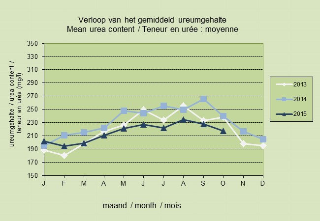 Het ureum wordt elke keer bepaald. Ons gemiddelde in 2014 was 287. Het jaargemiddelde van alle bedrijven volgens MCC was 230.