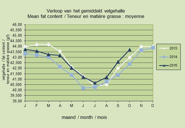 Het vetgehalte varieert afhankelijk van de seizoenen: in de zomer is het lager en in de winter hoger. Dit is duidelijk te zien op de grafiek vanop de website van MCC. Dit heeft niet te maken met weidegang want onze koeien blijven op stal en krijgen altijd ongeveer hetzelfde rantsoen, en toch was ook in de zomer het vet lager. Het voeder is echter wel een andere omgevingsfactor die invloed heeft op het vetgehalte. Daarnaast is het gehalte ook afhankelijk van de erfelijke aanleg van de dieren.