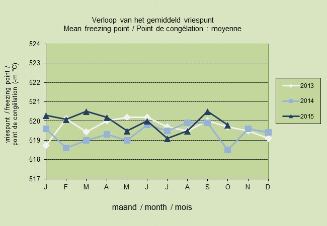 Het vriespunt van melk ligt redelijk constant: rond 518 a 520, wat duidelijk op de grafiek te zien is. Wanneer het vriespunt te laag is, is dit een aanwijzing op het feit dat er te veel water in de melk zit. Dit komt dan meestal door een verkeerde reiniging omdat er te veel spoelwater in de leidingen of dergelijke achterblijft en dan met de melk mee in de melktank komt. Wij hebben dit vorig jaar voor gehad, te zien op de afbeelding rechts, doordat er ergens een terugslagklep niet goed werkte. Om geen strafpunten te ontvangen, moet het vriespunt boven 510 blijven. De beoordeling gebeurt op het rekenkundig gemiddelde van de afgelopen maand.