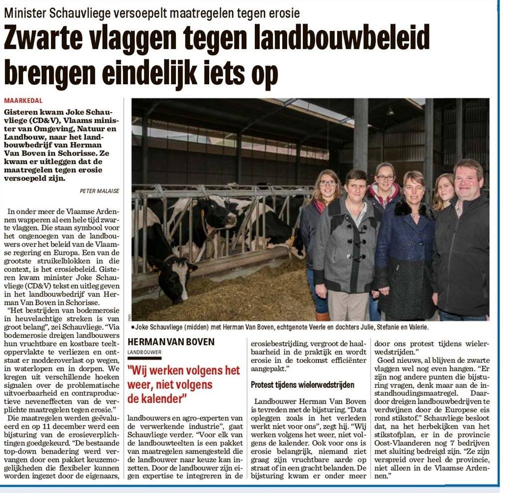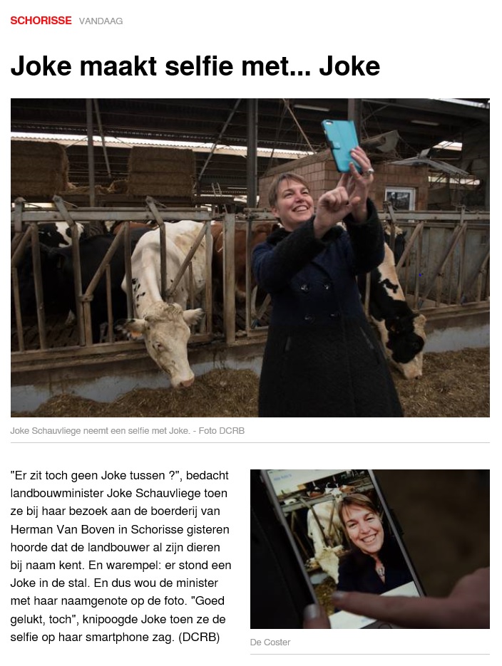 Er werd over meer dan erosie gesproken want we gaven ook een rondleiding op ons bedrijf. We voelen ons enorm vereerd om Joke Schauvliege ons bedrijf te hebben mogen tonen. Het werd een erg aangename namiddag. We vertelden ook dat al onze koeien een naam hadden. Hierop vroeg de minister of er ook een Joke was en inderdaad, er is een Joke op ons bedrijf aanwezig. Het is zelfs een speciaal dier want we hebben haar cadeau gekregen van de vier hoofdsponsors van onze opendeurdag, die plaatsvond op zaterdag 28 juni 2014. Ons Joke is afkomstig van een top melkveebedrijf uit Kaprijke. Ze heeft haar mooie naam dus te danken aan de familie Matthys. Twee Jokes bij elkaar op de foto zorgde voor onvergetelijke momenten. Hieronder vinden jullie het artikel dat er ook over werd geschreven, met de foto’s.
