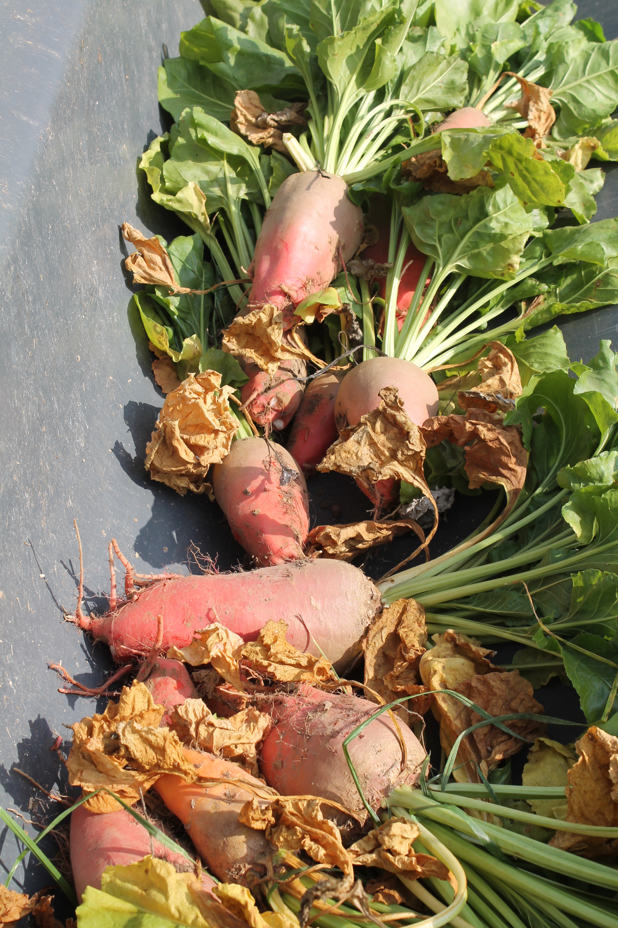 Half september zijn we begonnen met dagelijks een 500-tal kg bieten met de hand uit te doen. Het waren al enkele heel droge weken geweest en de toestand op het veld was optimaal. We konden de bieten gemakkelijk uittrekken en klopten ze dan tegen elkaar zodat de (weinige) aarde die er nog aan hing, er dan ook af was. Het loof hebben we gerust gelaten en kregen de koeien dus ook bijgevoederd. In oktober dreven we de hoeveelheid langzaamaan op, tot zo’n 1200 kg. Toen was het wel al natter en was het moeilijker om alle aarde nog van de bieten af te kloppen, wrijven.