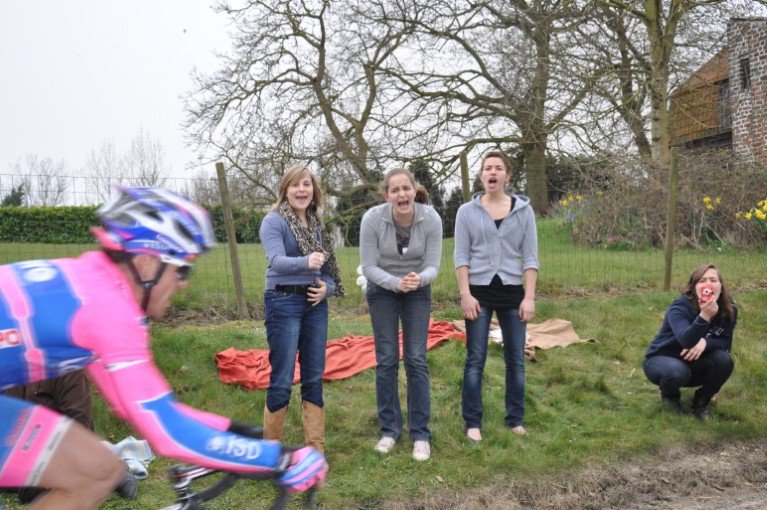Het is een foto die door iemand anders werd genomen, een foto waar ik samen met m’n drie zussen op sta. Dit kiekje dateert van 26 maart 2011, van de E3 Harelbeke dacht ik. Toen gingen we nog allemaal naar school – wauw. Nu zoeken we tijd tussen ons werk door! Het is eigenlijk een typisch beeld: ikzelf volop aan het fotograferen – toen nog met een simpel kodakje – en m’n zussen uit volle borst aan het roepen! Vooral Valerie zal met haar helse stem al menige trommelvliezen hebben doen trillen!
