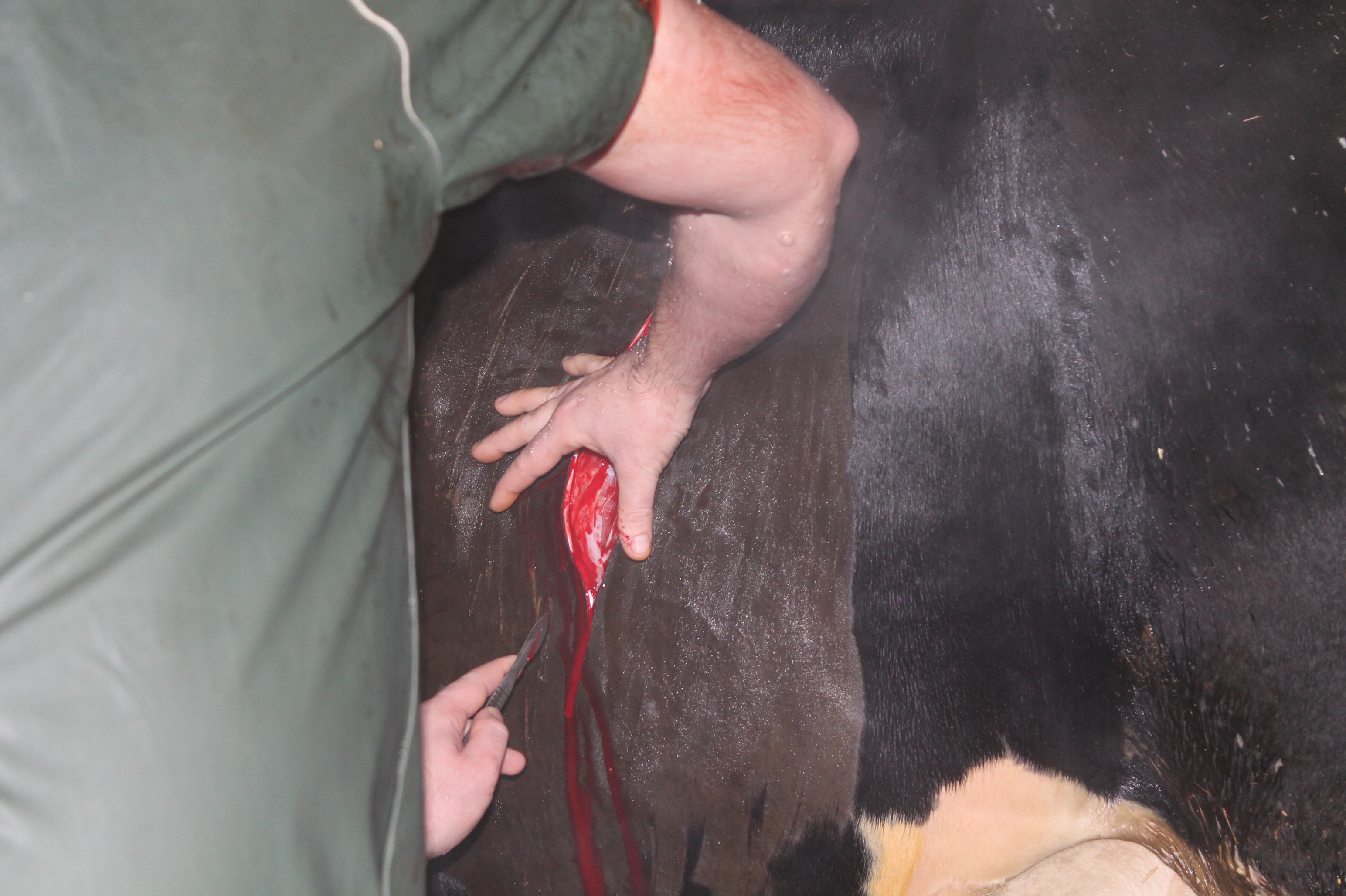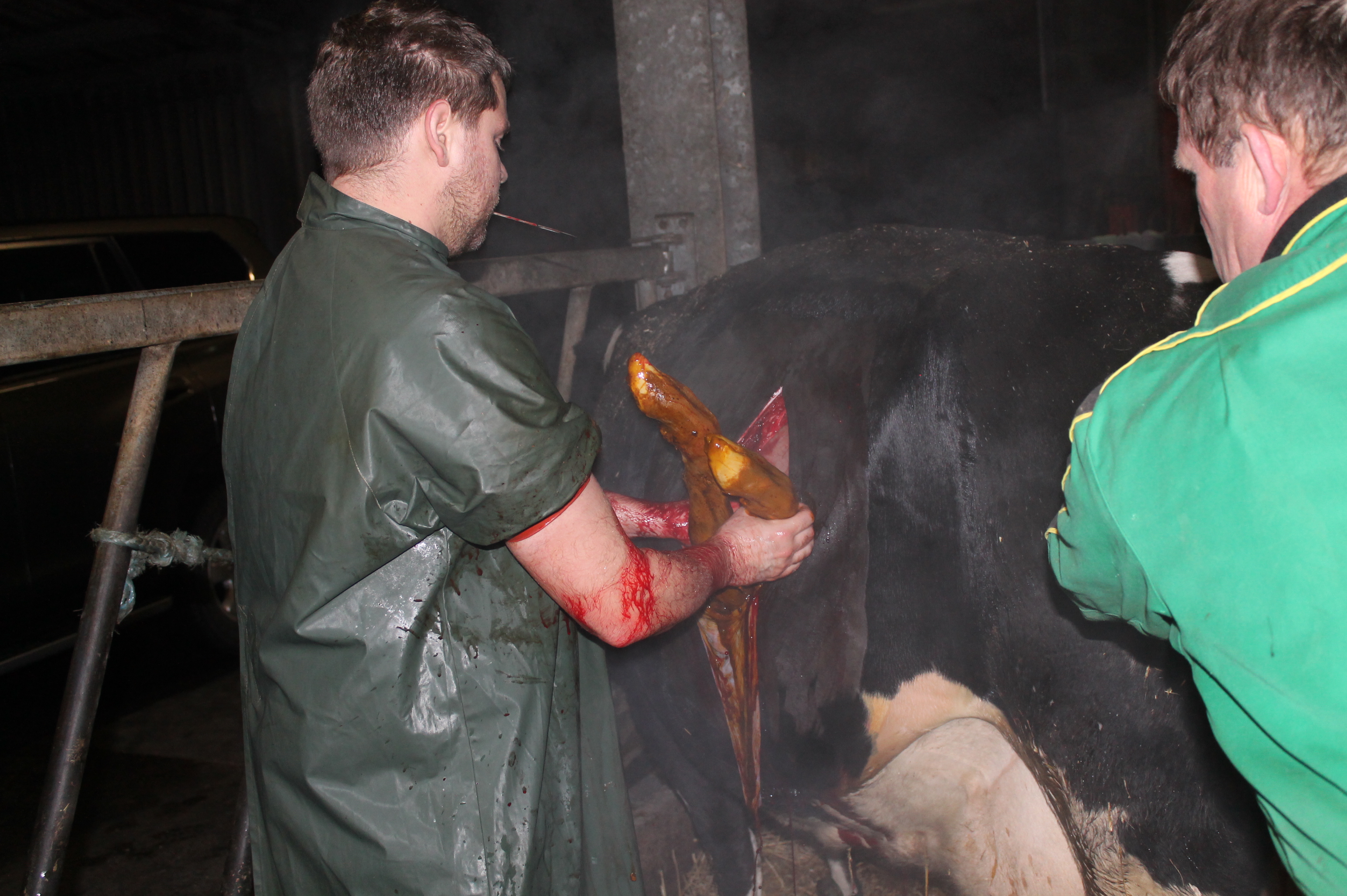Eenmaal de baarmoeder voorzichtig is opengesneden, komen de placenta en de poten van het kalf snel naar buiten. Hier is goed te zien dat het kalf al geel-bruin ziet. Hoog tijd om hem eruit te halen!