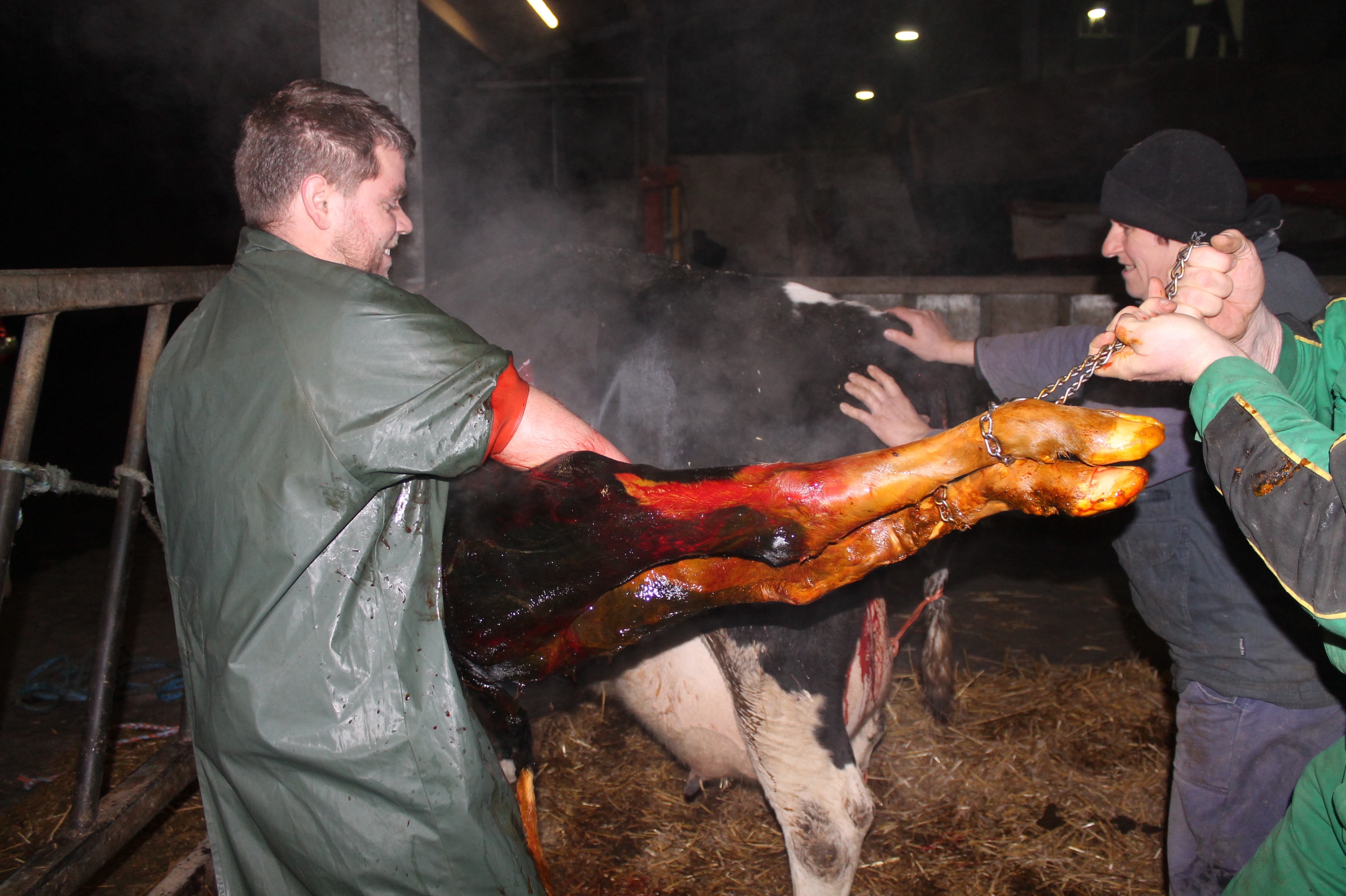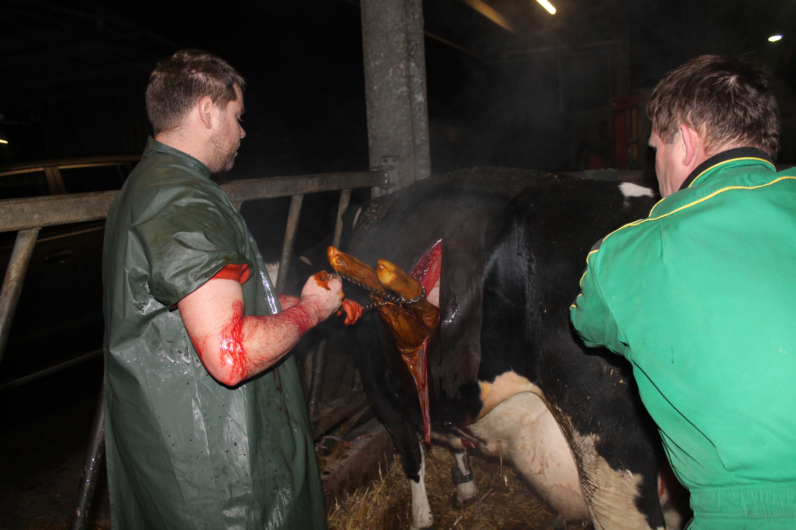Er wordt een ketting aan de poten gedaan en zo trekt iemand aan de poten, terwijl de veearts het kalf zal vastnemen en het zo uit de (baar)moeder zal halen. Lachende gezichten zijn al te zien…
