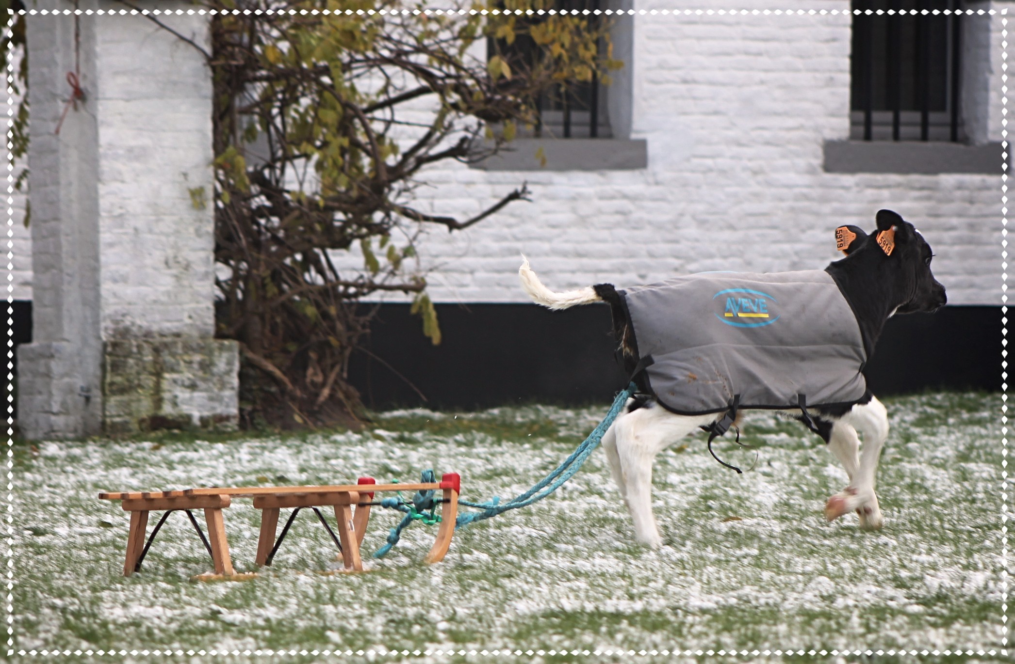 Ik zeg voorsmaakje want alle beste foto’s krijgen jullie op 24 december te zien! Kom dan dus zeker eens kijken! Deze foto’s heb ik genomen op 1 december, de dag na de dwarrelende sneeuwvlokjes in de stal. De bedoeling was eigenlijk dat het kalf zou stil staan maar dat lukte niet echt want Venezuela was super actief! De slee heeft alle kanten van het gazon gezien! Geweldig toch, gelukkige en schattige kalfjes! Ik toonde er dit jaar al enkele, denk maar aan Roza en Bex.
