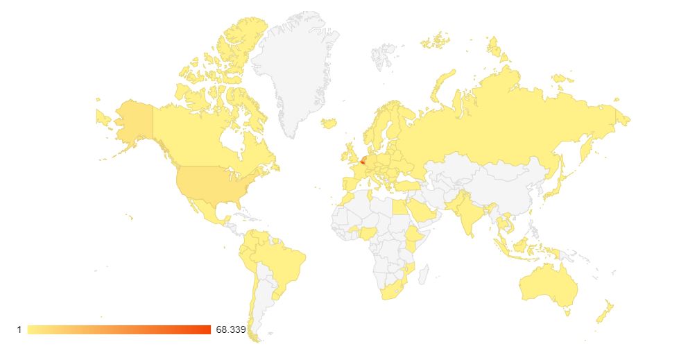 De totale cijfers van de afgelopen drie jaar bevatten nu ook wel al de cijfers van een goeie twee weken 2018. In 2017 kreeg m’n blog bezoekers uit zo’n 65 landen (uit 53 landen in 2016) en in het totaal op die drie jaar nu al uit 81 landen! De wereldkaart raakt dus intussen ook bijna helemaal volgekleurd.