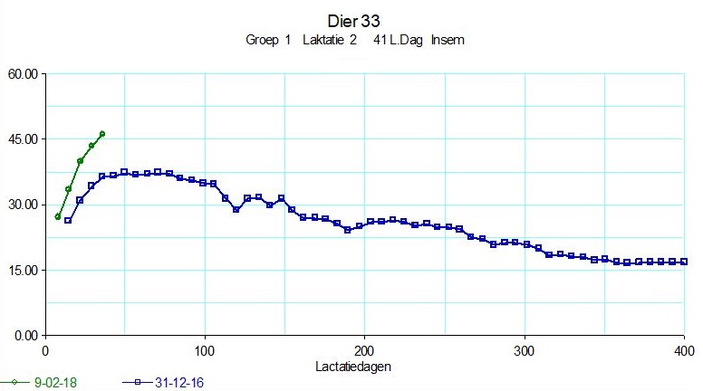 Toppers van vorig jaar, die ik beschreef in Kalfjes worden groot, tonen dit nu aan. Zo heb ik hieronder de lactatiegrafiek van Axelle. Tijdens haar eerste lactatie haalde ze 9601 kg melk. Intussen heeft ze opnieuw gekalfd en is ze super gestart. Vandaag gaf ze op haar 41e dag een goeie 46 kg melk, het meeste tot nu toe, maar haar piek zal het nog niet zijn!