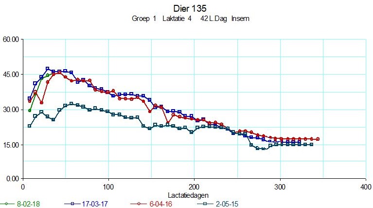 Zo’n grafiek met meerdere lactaties is trouwens heel interessant. Met de curves van Julianne kan ik tonen hoe we het ook wel graag hebben: al goed in haar eerste lactatie en vervolgens beter. Daarom niet met een super hoge piek en ze heeft misschien ook niet heel lang aangehouden, maar dat komt omdat ze telkens snel drachtig is. Haar gemiddelde tussenkalftijd bedraagt slechts 338 dagen! Alle koeien zijn anders maar hebben allemaal wel iets te bieden.