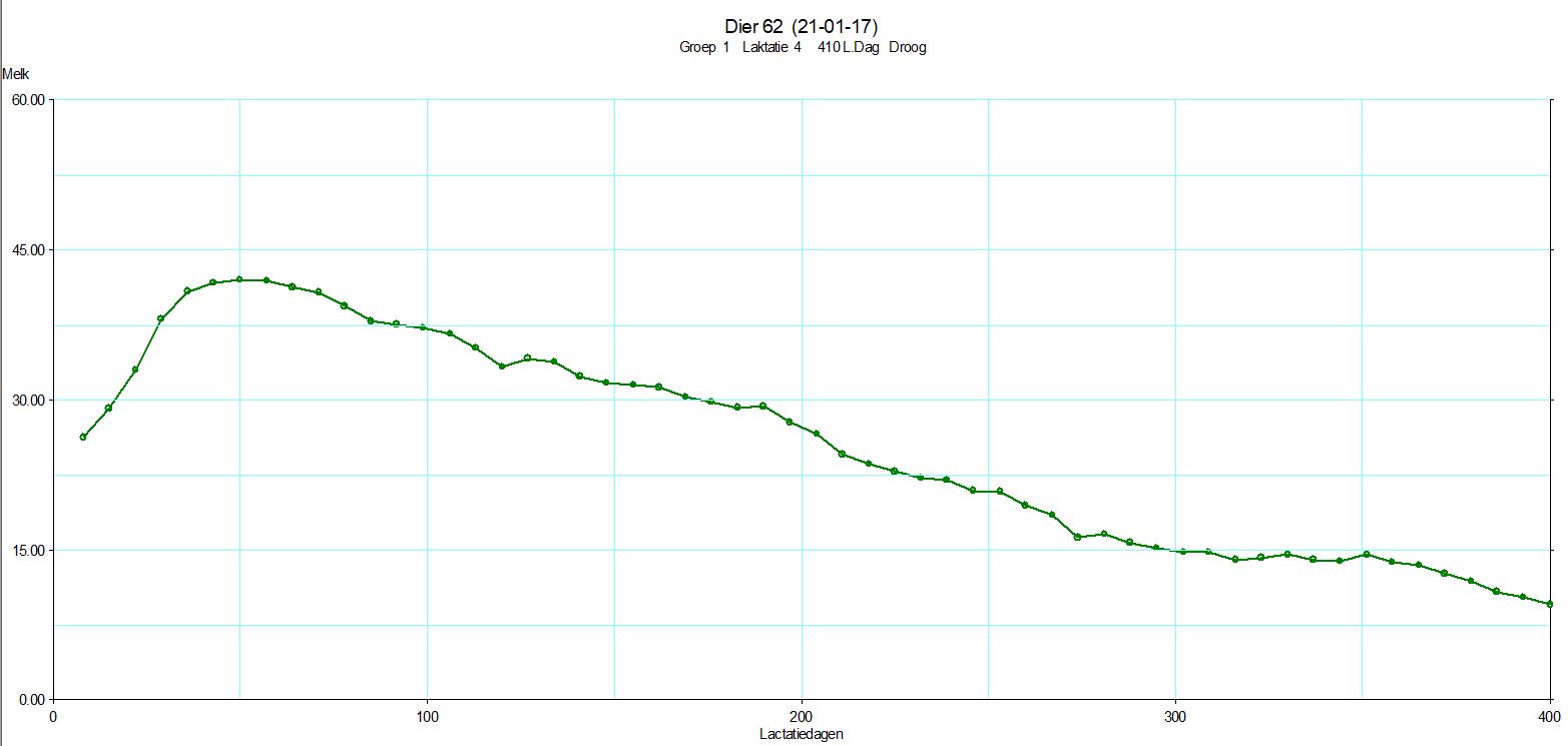 Rond zo’n 60 lactatiedagen piekt de melkgift: de koe behaalt het hoogste productieniveau van de gehele lactatie. Bij de ene koe is dit al op dag 50, bij een andere rond dag 70. Vanaf nu zal de melkgift geleidelijk aan dalen. Hoe trager, hoe beter want we hebben liever dat een koe haar melkgift lang aanhoudt of dat de koe met andere woorden persistenter is.