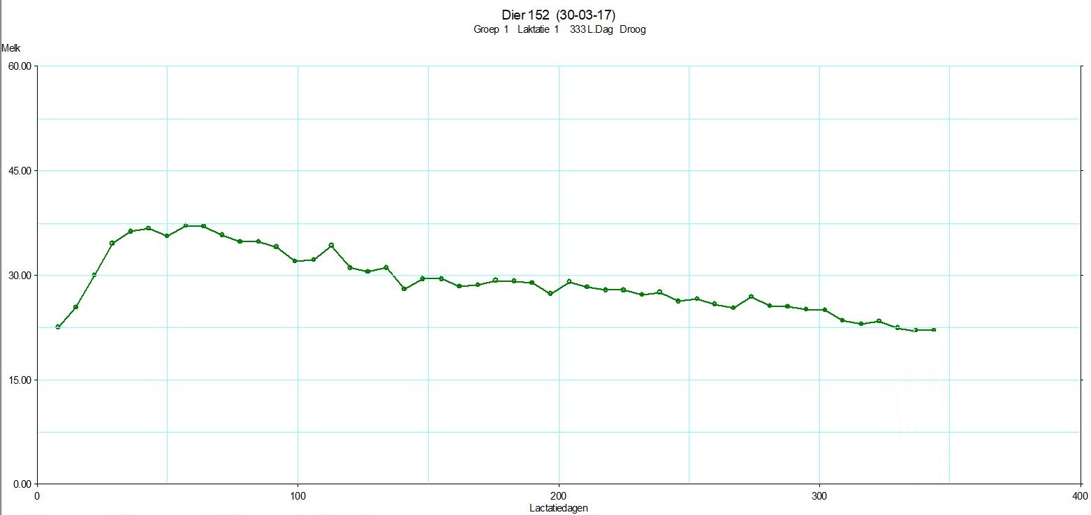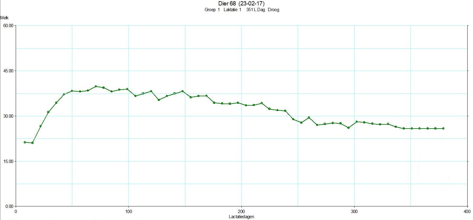 Wanneer een koe gekalfd heeft, begint ze melk te geven. Dit doet ze zo’n 350 dagen lang en daarna mag ze zo’n 45 dagen in droogstand. Om vervolgens terug te kalven en een nieuwe lactatie te beginnen. Dit vertelde ik eerder bij de berichten over koeien droogzetten en van kalf tot koe op twee jaar. Maar hoeveel melk geeft een koe op één lactatie en hoe is dit verdeeld over die 350 dagen? Ik toon het met enkele lactatiecurves van onze koeien. Enkele zeg ik want er zitten uiteraard verschillen op: niet iedereen bereikt dezelfde melkgiftpiek en de ene koe is ook persistenter dan de andere.