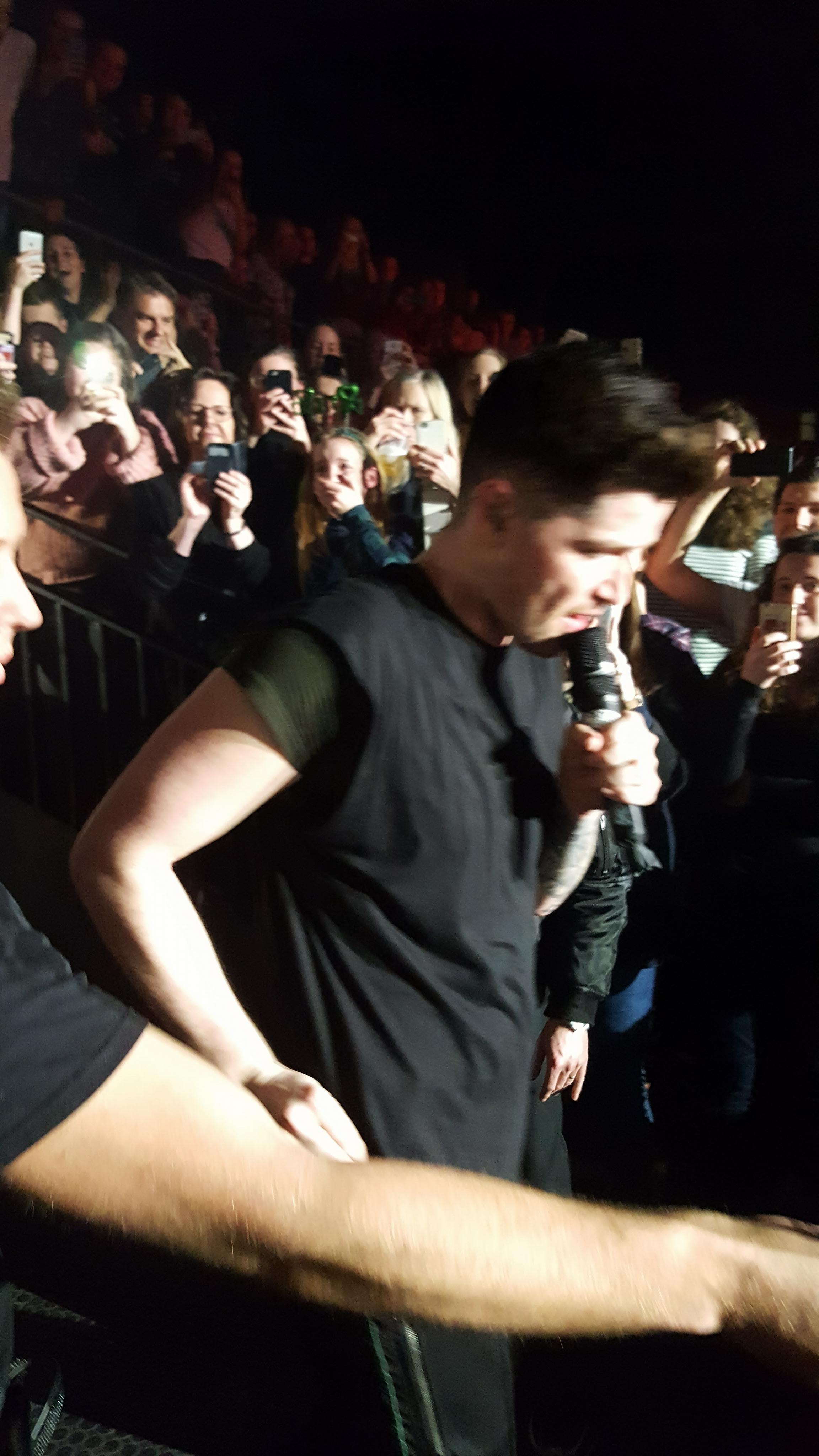 tribune aan de linkerzijde van ons. Wij zaten zo goed als helemaal achteraan, wat we niet erg vonden want van hieraf heb je wel een zicht op de volledige zaal. Maar we dachten dus niet dat ze tot bij ons zouden komen. Maar er verscheen zo al security in onze gang, ja, we zaten net aan het gangpad! Het begon al te kriebelen binnen in mij! Het zal toch geen waar zijn zeker? Maar jawel, daar verscheen Danny! Hij zong eventjes op een meter van ons! Misschien wat onnozel dat ik er zo euforisch van werd, maar het gebeurt natuurlijk niet elke dag dat een internationale ster waarvan je de liedjes meezingt zo heel dichtbij je staat én zingt! Hij liep enkele rijen onder ons door de rij en enkele blokken door. Super moment dat ik niet snel zal vergeten!