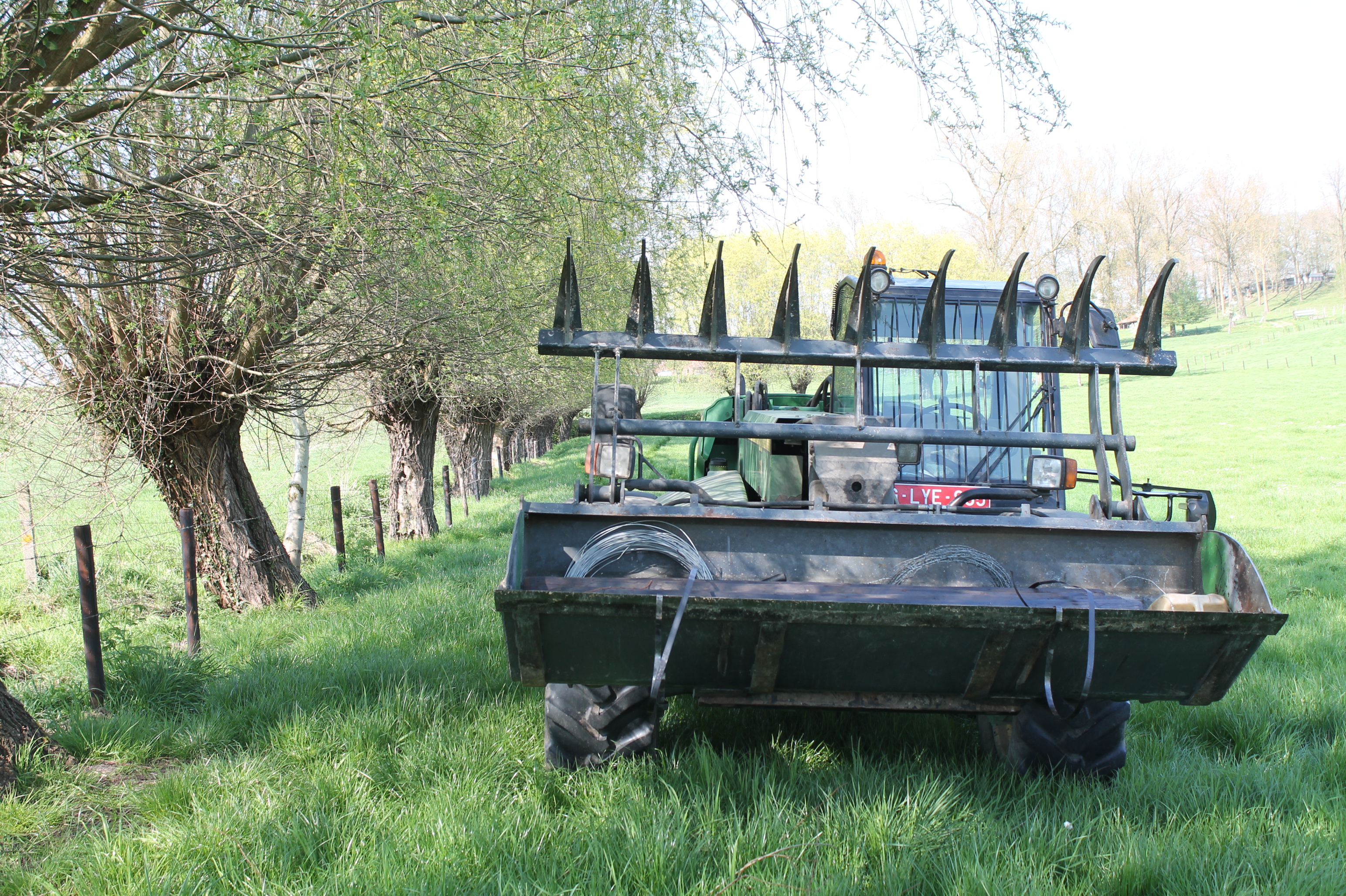 Mama en ik hielden ons in april vooral bezig met het controleren van de omheining van de weides. Dit doen we telkens met de verreiker: al het materiaal (zoals palen, draden, krammen, hamers en tangen, schop en spade) er in en zo de weide rond.