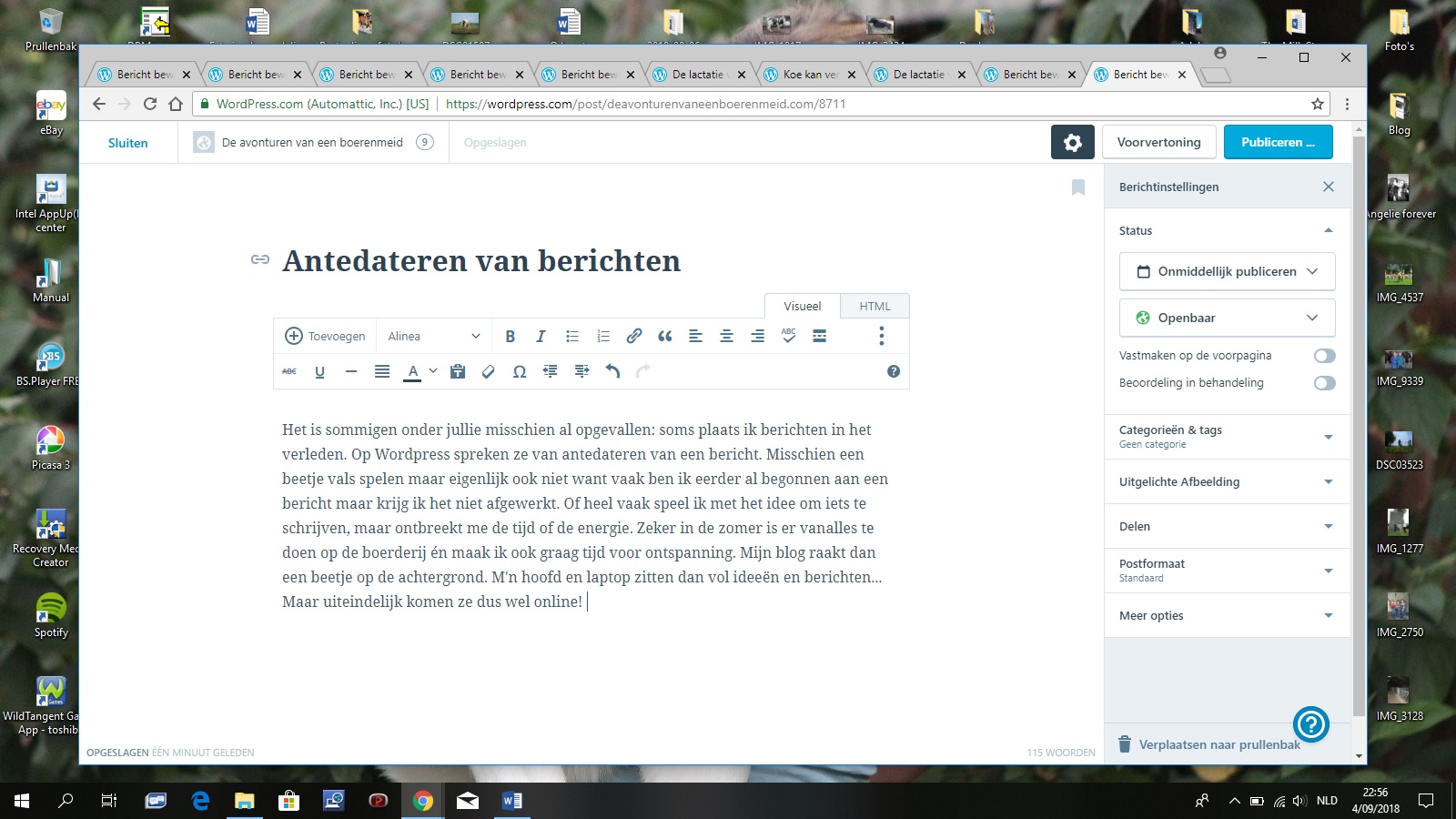 Het is sommigen onder jullie misschien al opgevallen: soms plaats ik berichten in het verleden. Op WordPress spreken ze van antedateren van een bericht. Met verleden bedoel ik tot enkele weken terug. Misschien een beetje vals spelen maar eigenlijk ook niet want vaak ben ik eerder al begonnen aan een bericht maar krijg ik het niet afgewerkt. Of heel vaak speel ik met het idee om iets te schrijven, maar ontbreekt me de tijd of de energie. Zeker in de zomer is er vanalles te doen op de boerderij én maak ik ook graag tijd voor ontspanning. Mijn blog raakt dan een beetje op de achtergrond. M’n hoofd en laptop zitten dan vol ideeën en berichten maar uiteindelijk komen ze dus wel online!