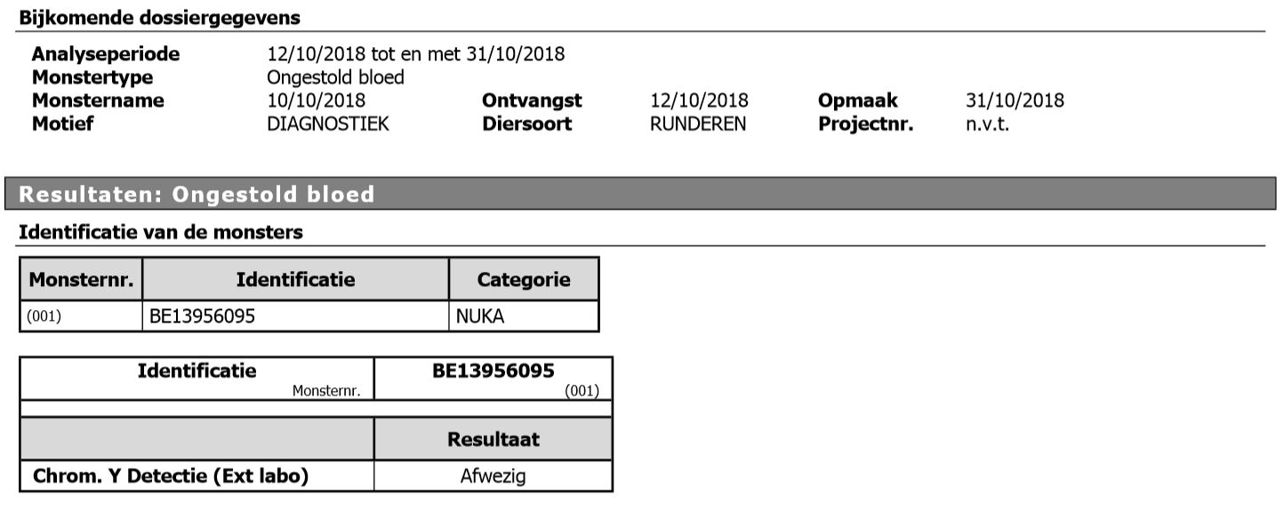 De meeste rundveehouders laten een tweelingvaarsje niet controleren, ook wij hadden het nog nooit laten doen. Maar omdat het hier om een dochter van Becky ging, maakten we een uitzondering. Wat zijn we daar blij om! Het bloedonderzoek toonde namelijk aan dat er geen Y-chromosoom werd gedetecteerd, zoals jullie hieronder kunnen zien. De geslachtschromosomen van een vrouwtje zijn namelijk twee X-chromsomen (XX) en van een mannetje een X- en een Y-chromosoom (XY). Tijdens de dracht van een koe komen de bloedbanen bij 90 % van de tweelingen met elkaar in contact, waardoor er bloedcellen worden uitgewisseld. Gebeurt dit bij een stier-vaars tweeling, dan kan er Y-chromosoom bij het vrouwtje terecht komen, waardoor het onvruchtbaar wordt. De volledige uitleg is in dit eerder blogbericht terug te vinden.