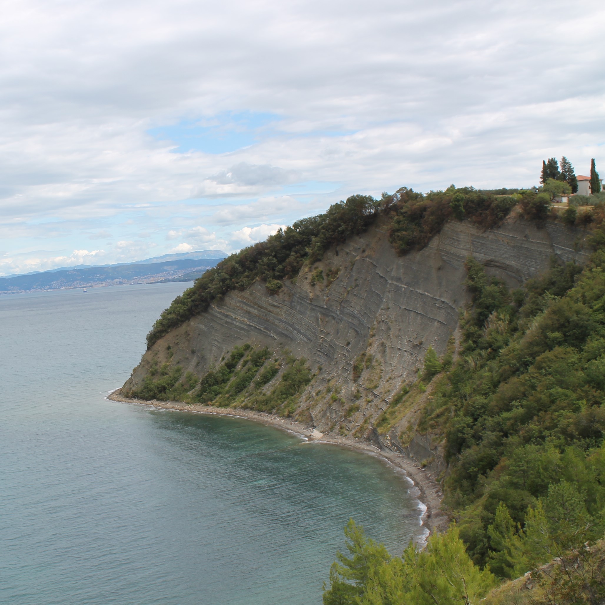 Na ongeveer een kilometer kwamen we aan Strunjanski kriz of het kruis van Strunjan (paarse kruis linksboven op de kaart). In deze omgeving zijn de indrukwekkende kliffen prachtig te bewonderen. Op onderstaande foto zien we Zaliv sv. Kriza of de baai van het kruis en Rt Ronek of de kaap Ronek.