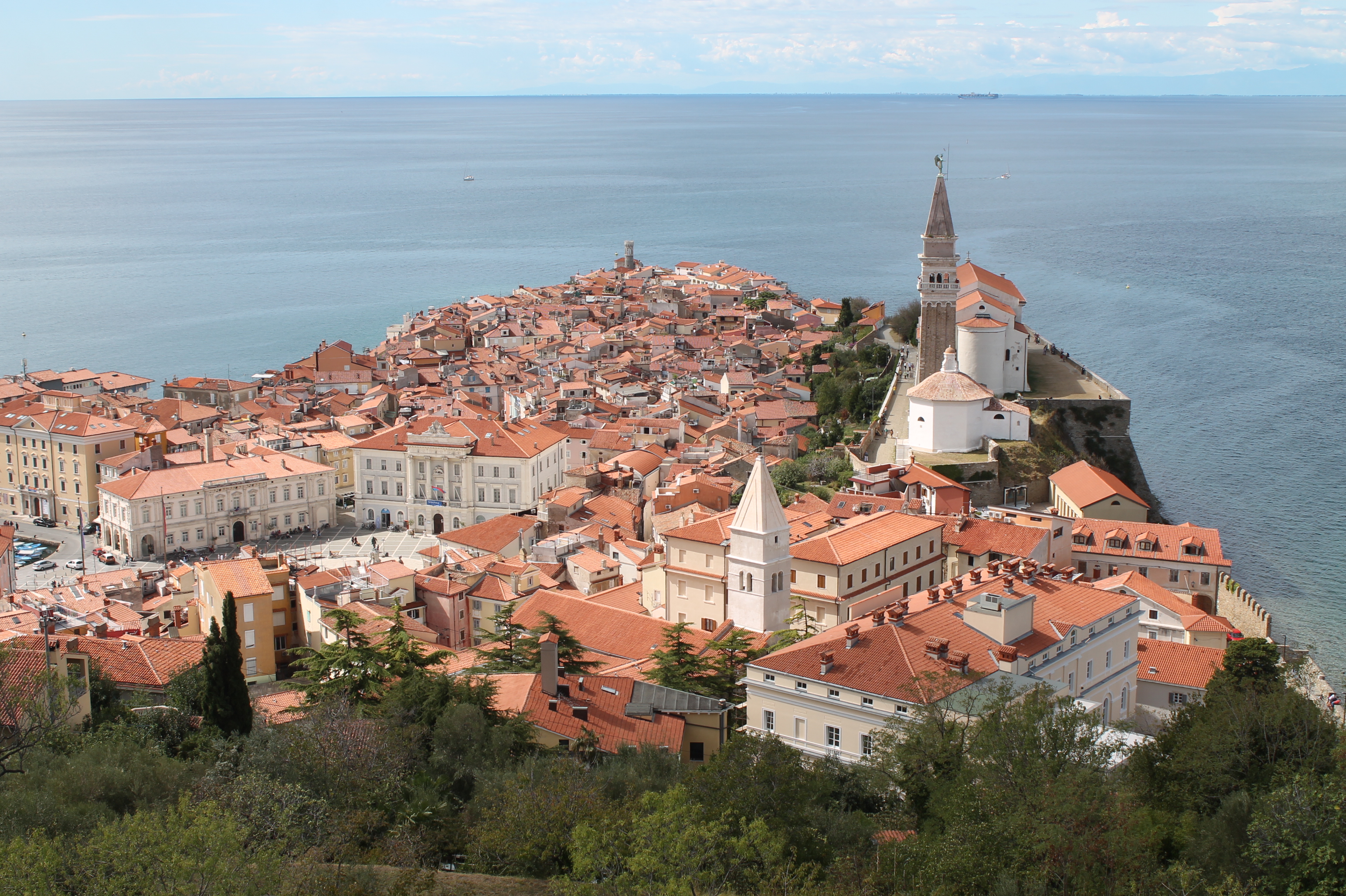 Het zicht op de stad Piran is er absoluut idyllisch: groene bomen, witte huisjes met rode daken en een helderblauwe zee. De opvallendste plaatsen van de stad zijn het Tartinijev trg of Tartini plein (links op de foto) en de Cerkev sv. Jurija of de Sint-Joris kerk (rechts). Net als in Koper en Izola zijn de straatjes hier nauw en niet toegankelijk voor auto’s.