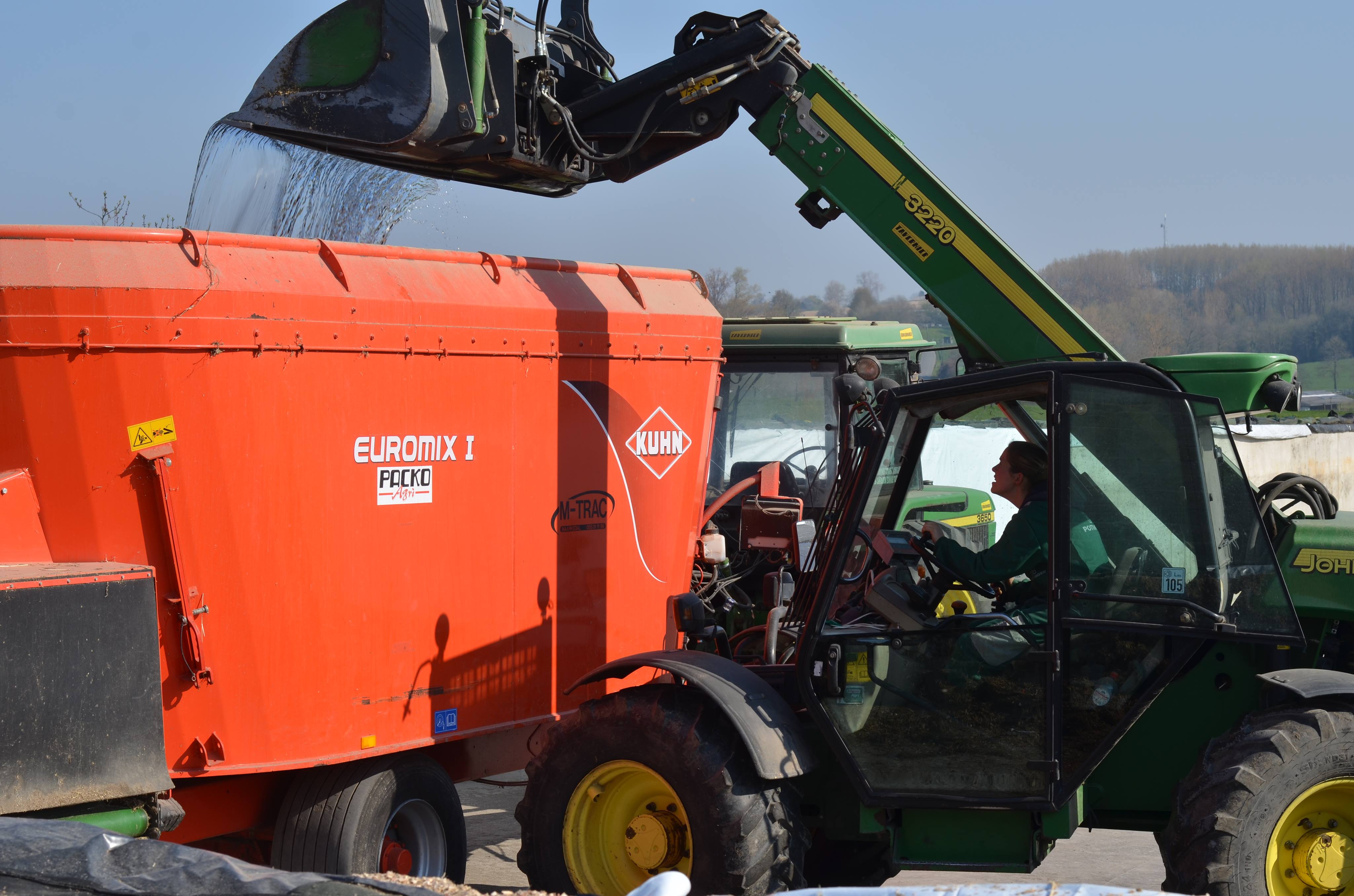 Op de tweede foto ben ik volop de voedermengwagen aan het vullen. In de beginmaanden van m’n blog schreef ik het voederen stap voor stap uit, ook nu lijkt het daar nog wel op. Op deze foto gaat er net water de mengwagen in.