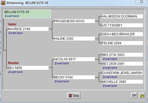 Hieronder geef ik jullie de afstamming van Bellini eens mee, zoals we die in het programma Ceres, waarmee we ons rundveemanagement doen, kunnen zien.