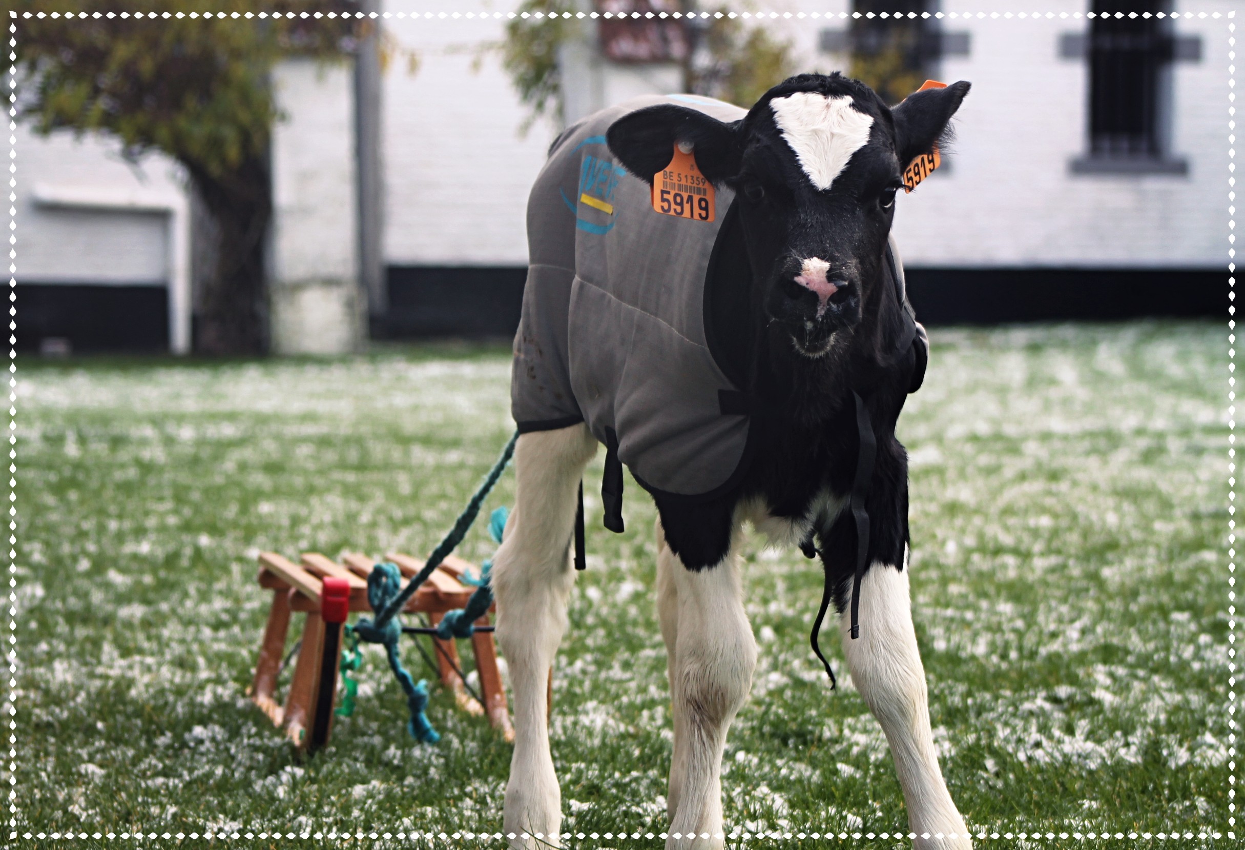 Naast haar zien we Venezuela, het kleine, zwart-witte koetje. Zij heeft onlangs voor het eerst gekalfd, iets vroeger dan op een leeftijd van twee jaar: een jaar en tien maanden was ze. Er gaat altijd een groep pinken bij de stier, dus zijn er oudere en jongere. Zij was van de jongste maar ze doet het goed, ze laat haar zeker niet doen! Het is al altijd een dulle geweest… Jullie kregen haar eerder te zien als fotomodel voor m’n kerstkaartjes van 2018! Ze dartelde vrolijk in de sneeuw, met een slee aan haar kalverbodywarmer. Check alle foto’s nog eens hier! Intussen ben ik trouwens al begonnen met brainstormen over m’n kaartjes voor 2020! To be continued!