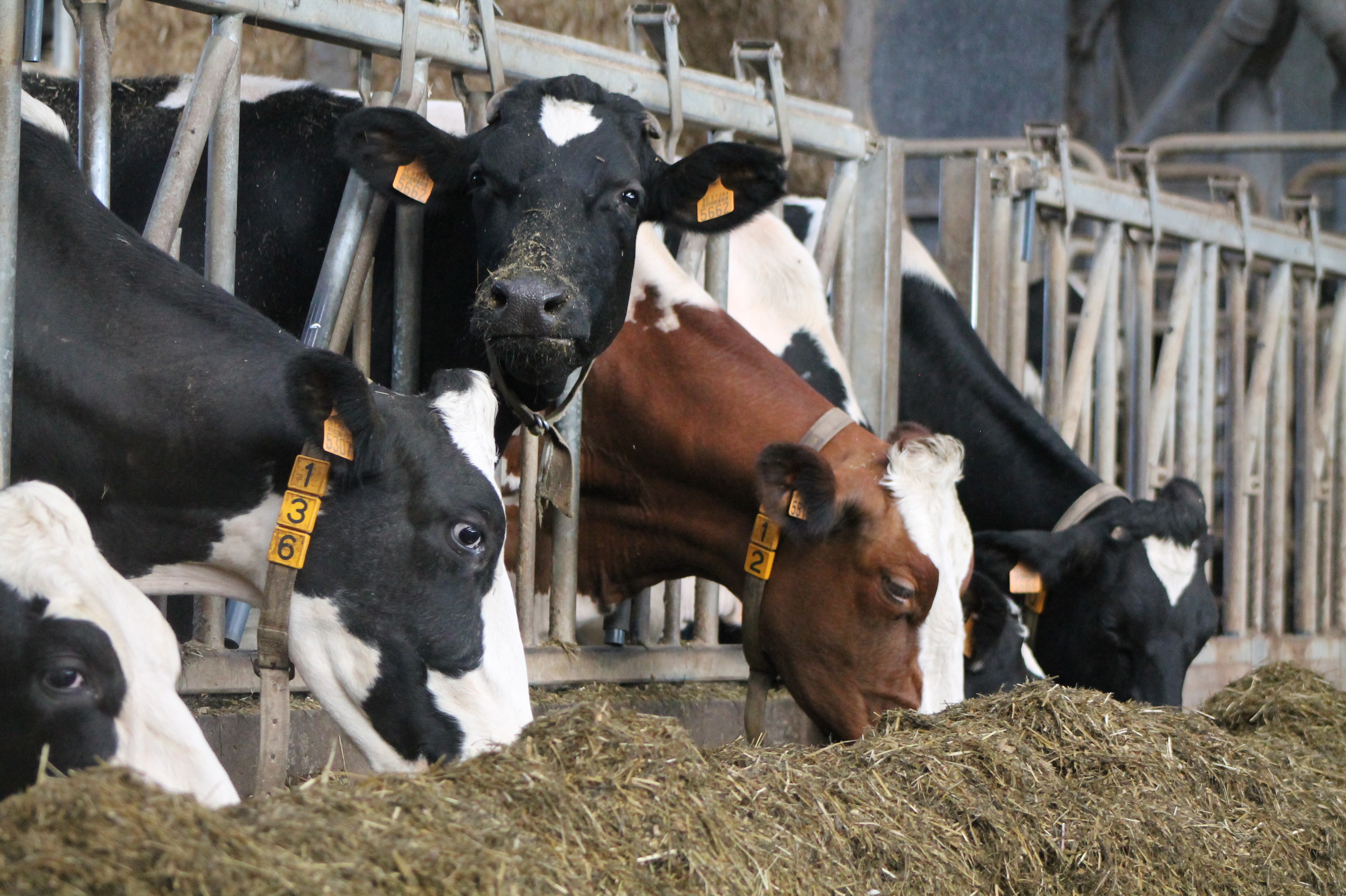 Koe Maggie is er wel nog, zij is aan haar vijfde lactatie bezig. Hieronder een foto van deze week, waar ze links in beeld staat te eten, met nummer 136. Alle koeien krijgen een nummer na hun eerste kalving, dat zichtbaar is aan hun halsband maar ook in hun pootband opgeslagen zit. Hun oormerk met 9-cijferig nummer krijgen alle runderen in de eerste levensweek, dit is hun officiële identiteit.