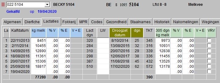 Ik ben heel trots op m’n Becky! Het is zo’n speciale koe, die m’n hartje gestolen heeft! Omwille van alles eigenlijk: ze is een super brave, kalme koe en is ook een topper op vlak van melkproductie. Hieronder toon ik de gegevens van haar lactaties, zoals we op de computer in softwareprogramma Ceres kunnen zien.