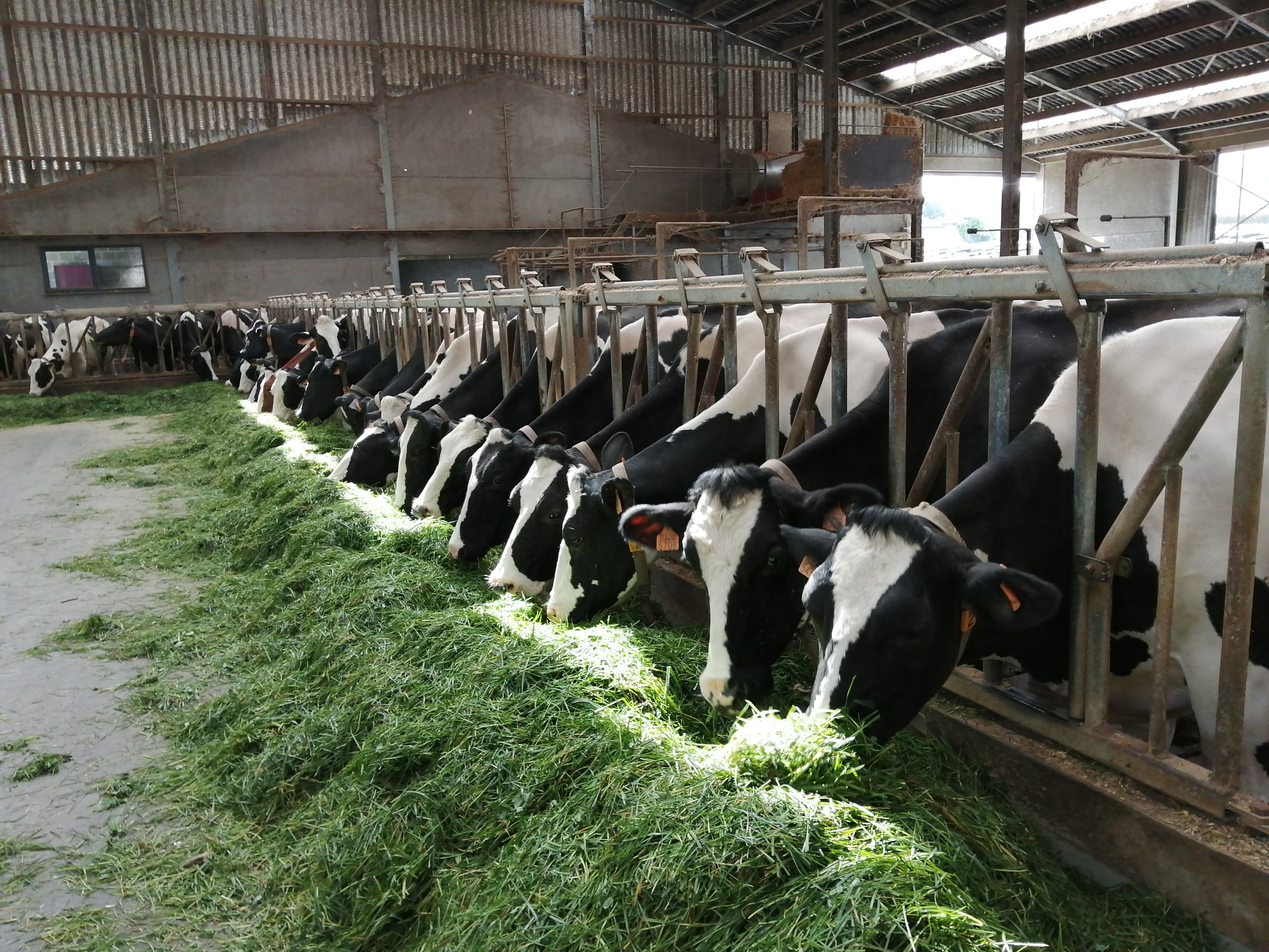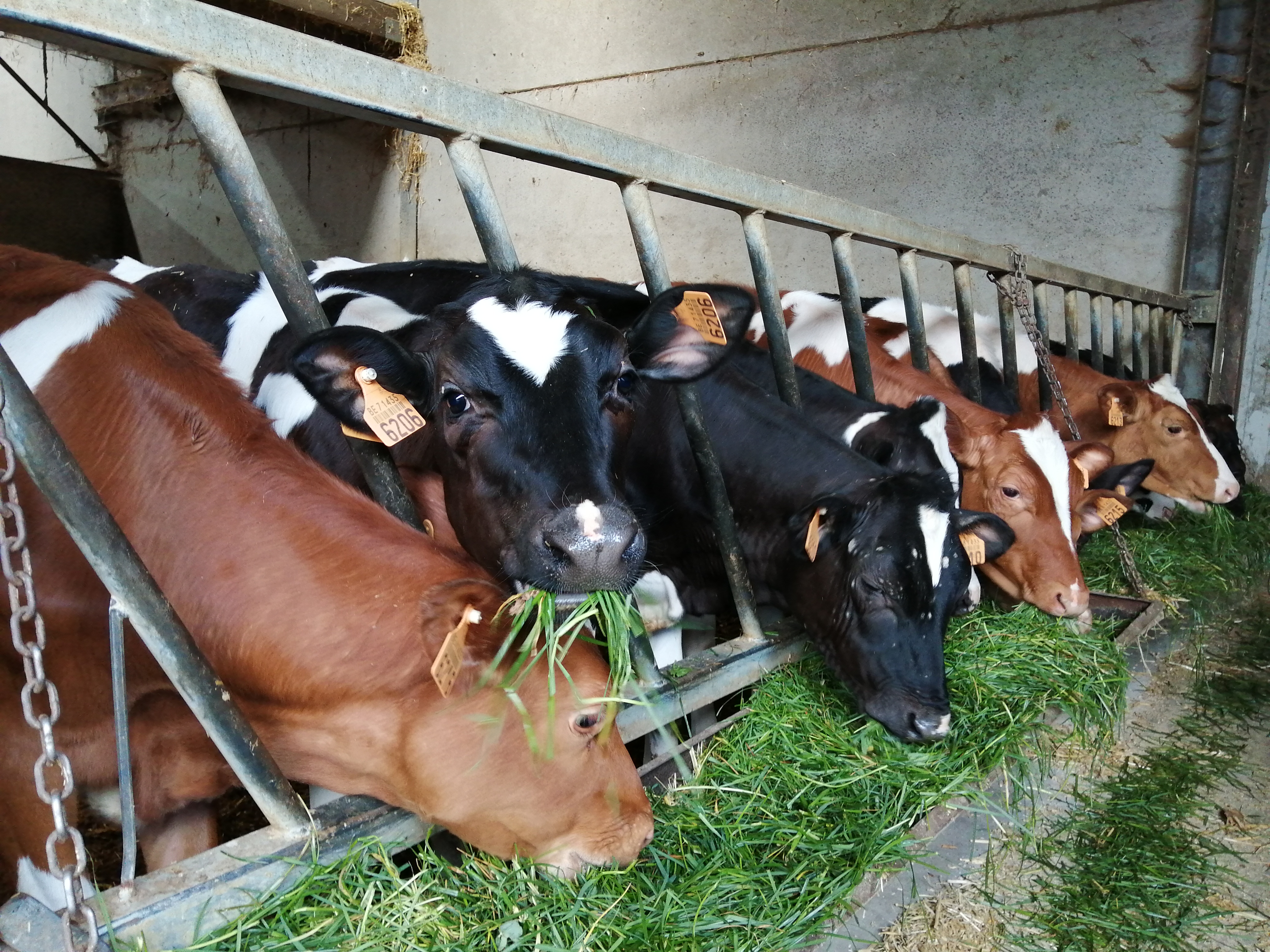 Elke dag sinds begin april krijgen de melkgevende koeien vers gras gevoederd, twee maal daags: rond 12 a 13 uur en rond 20 a 21 uur. Daarnaast krijgen ze rond 10 a 11 uur een mengsel van stro, maïs, perspulp, eiwitkern en mineralen gevoederd met de voedermengwagen. Ook het jongvee dat nog op stal zit, krijgt wat vers gras te eten. Hieronder enkele beelden…