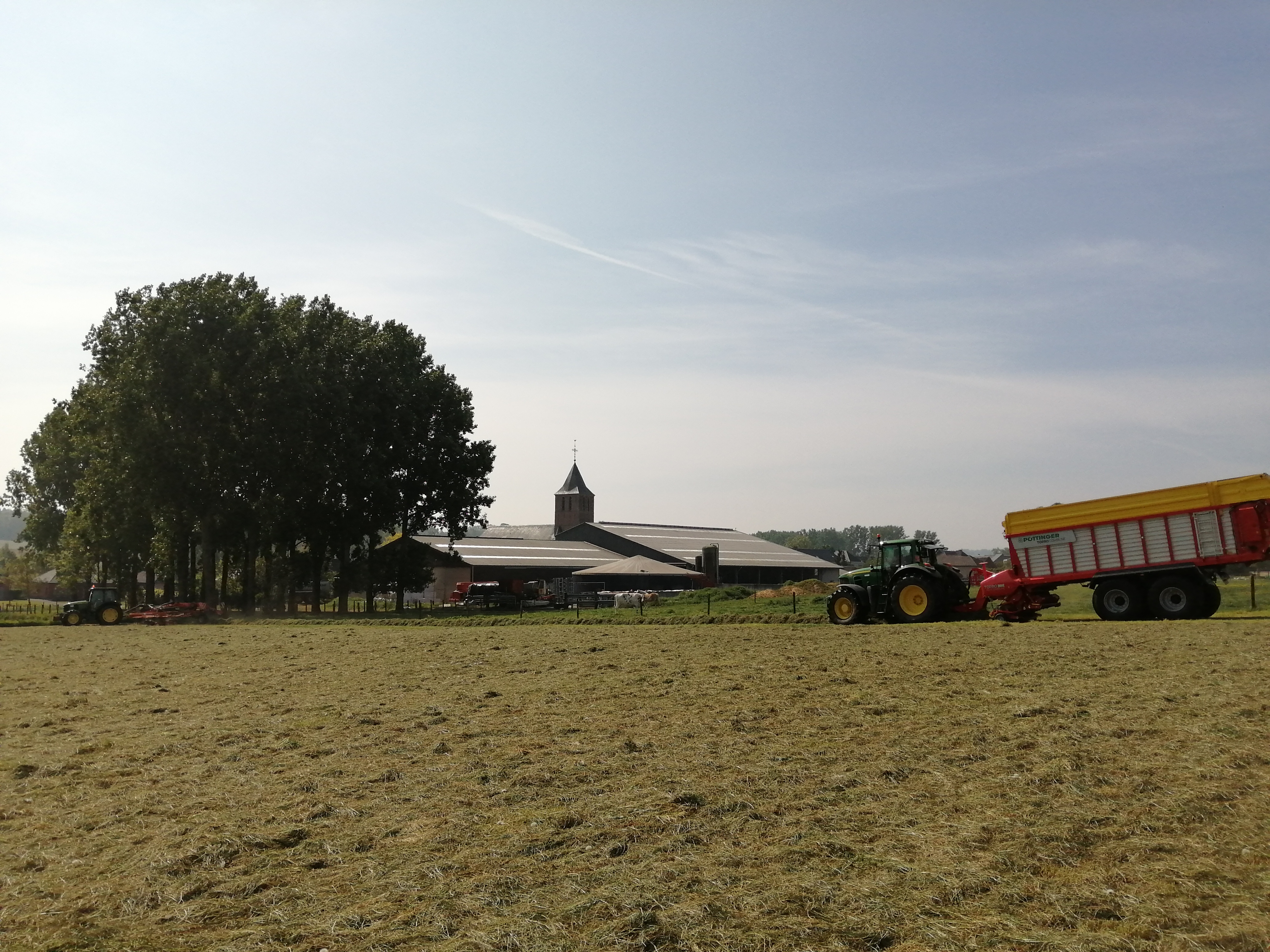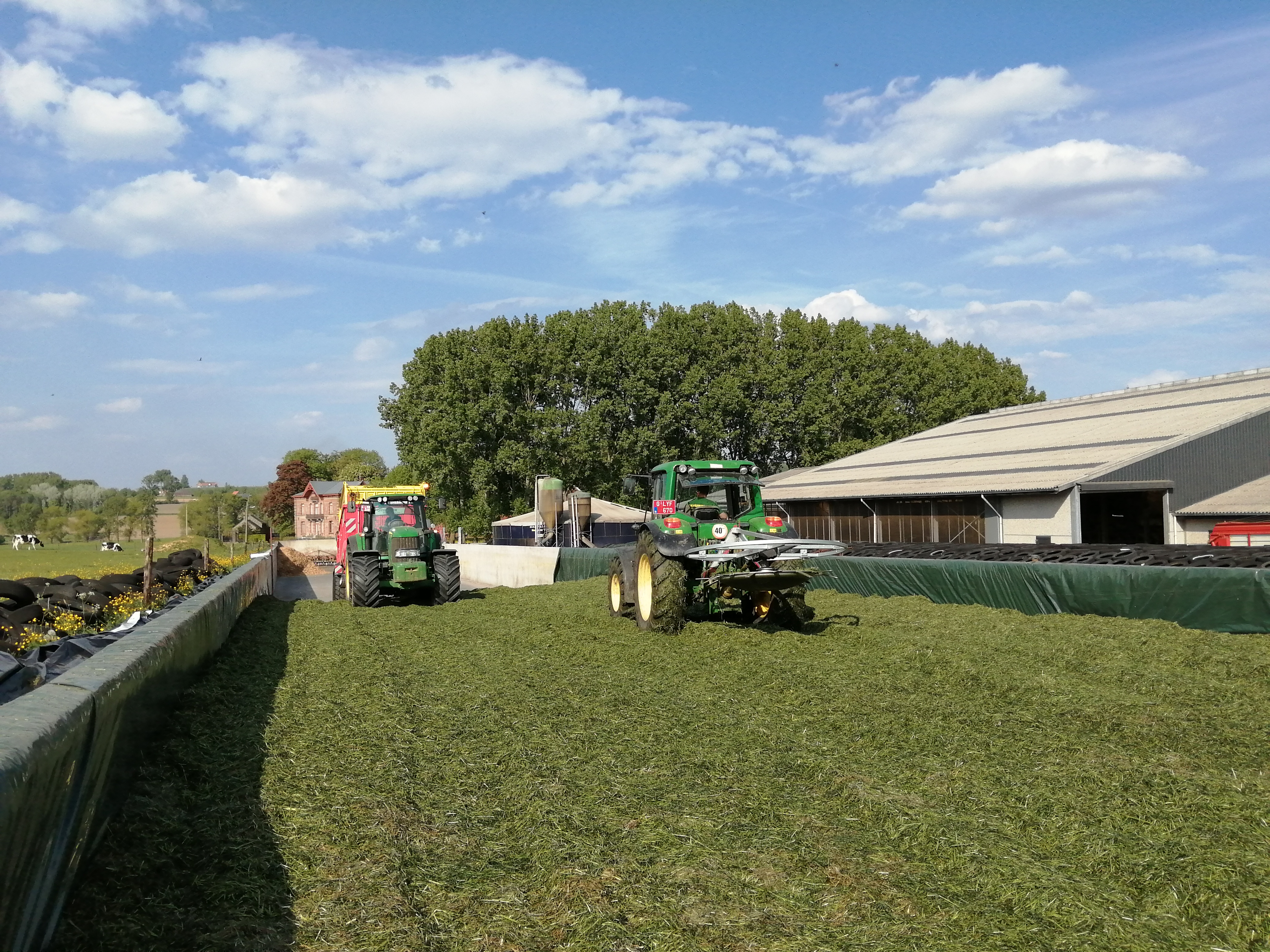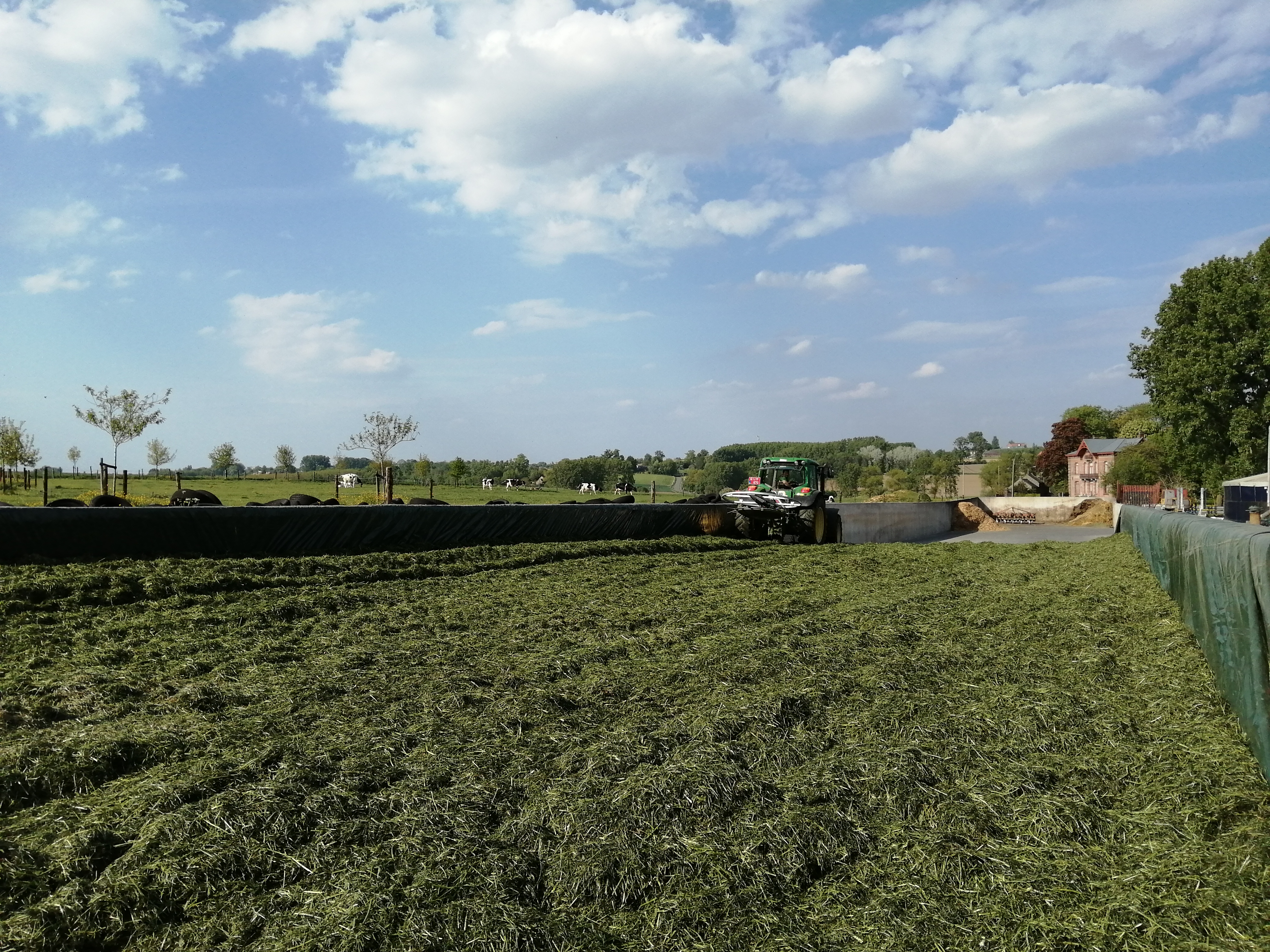 Op 25 en 27 april werd zo’n 20 ha gras ingekuild. Eerst gingen het er maar 10 zijn, maar vader besloot – met de weersvooruitzichten die slecht waren – dan toch nog eens 10 ha meer te maaien. Wanneer het te veel zou regenen, zou gras namelijk kunnen “vallen” = kunnen gaan plat liggen. We kuilden dit gras in op diezelfde 35 meter kuil waar het eerste gras van dit jaar werd ingekuild. Veel werk met de kuil ontdekken en dan terug dekken, maar gelukkig ging alles eigenlijk al bij al zonder problemen!