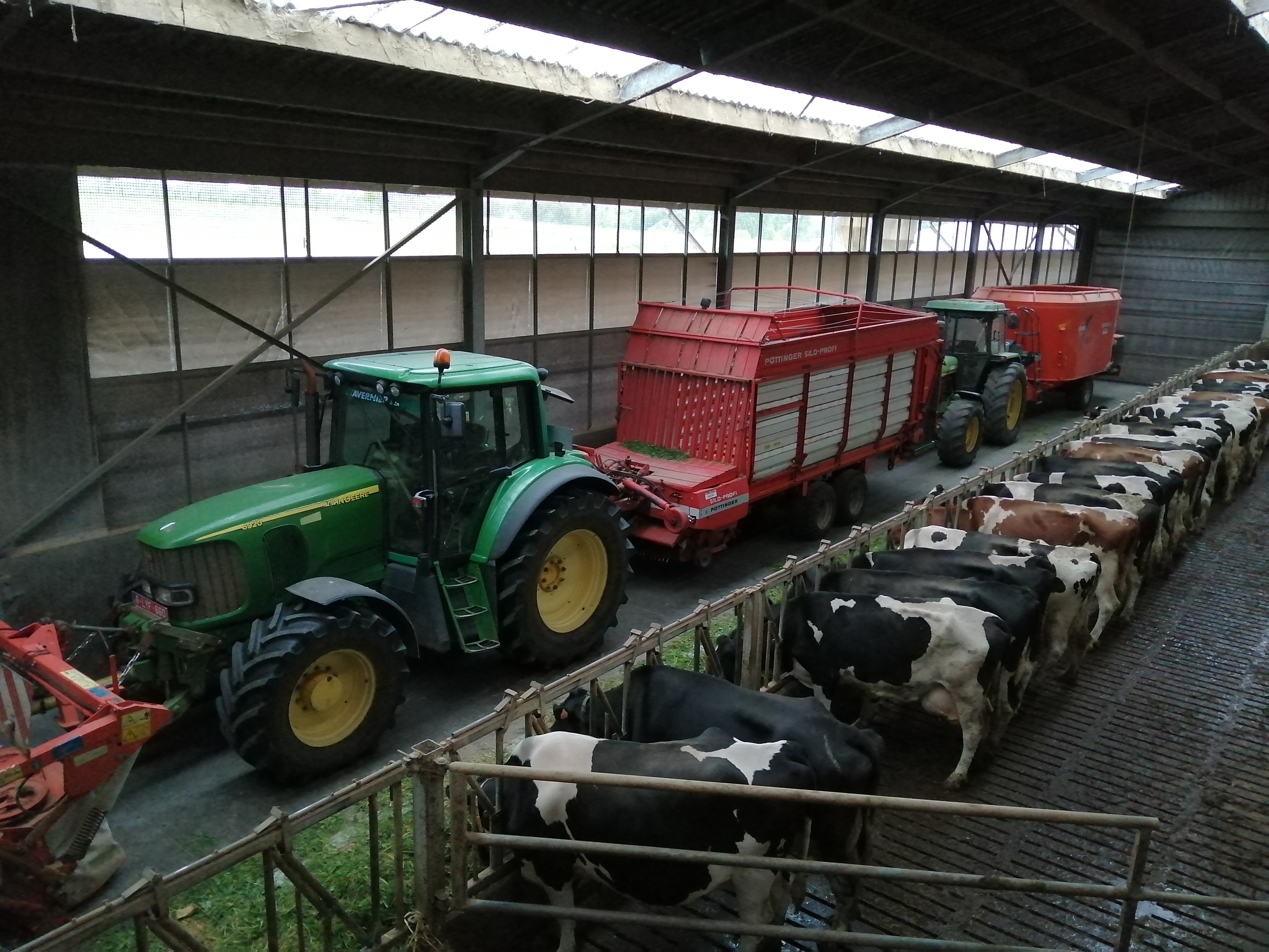 Op deze laatste foto zie je onze combinaties staan waarmee gevoederd wordt! Enkel de verreiker ontbreekt, waarmee de mengwagen wordt gevuld. Op Facebook en TikTok postte ik reeds een kort filmpje van het vers gras voederen, in de toekomst maak ik nog eens een langere video!