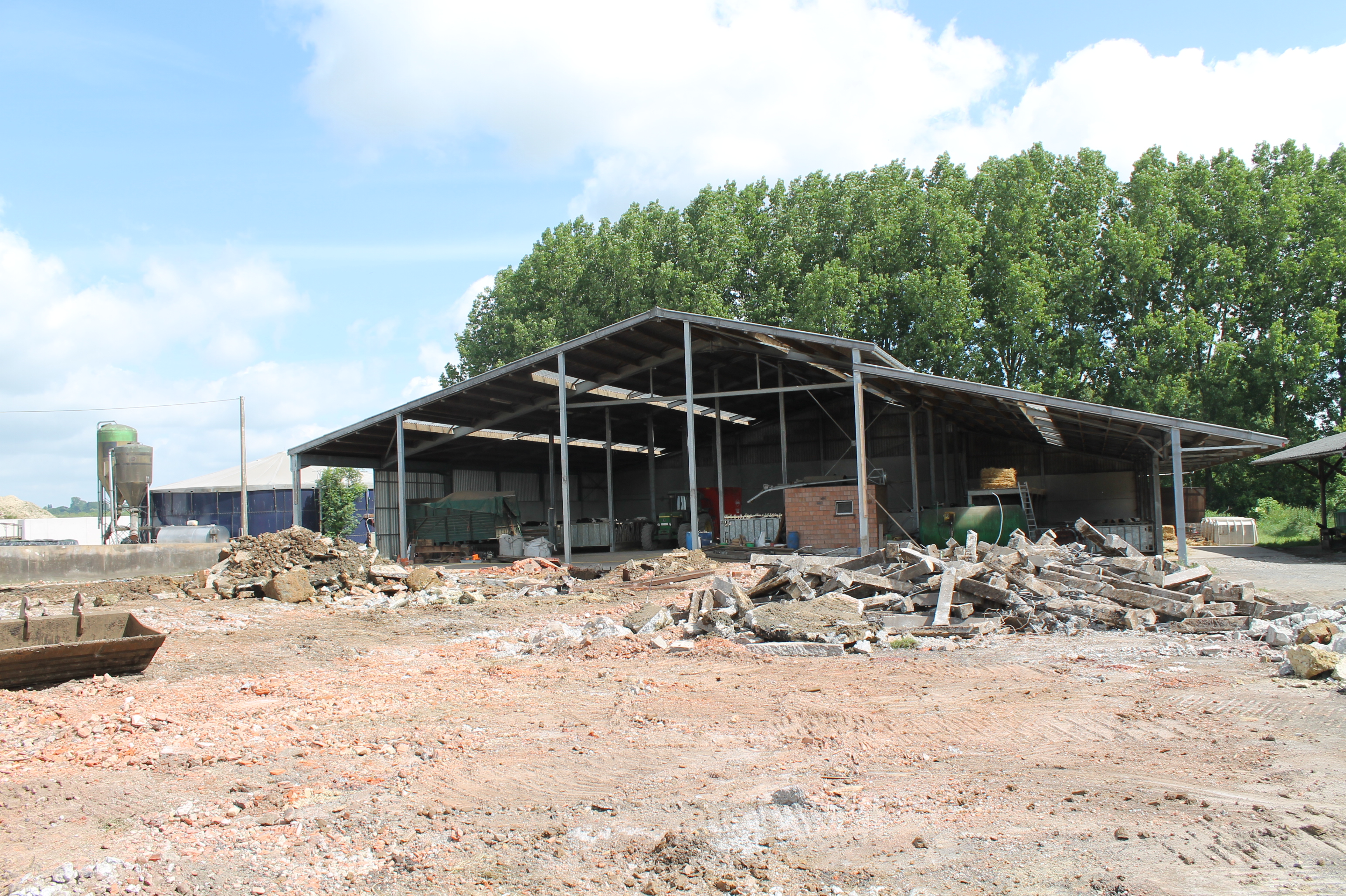 Op maandag 10, dinsdag 11 en woensdag 12 juni was het dan tijd voor de echte afbraak. Dit gebeurde door de firma Eeckhaut. Het meest delicate was nog de eternitplaten van het dak halen. Daarna knip, knip hier en knip, knip daar met de kraan, de woorden van de “kraanman”. Het ging effecief wel erg snel! Op een paar dagen werd onze stal met de grond gelijk gemaakt.