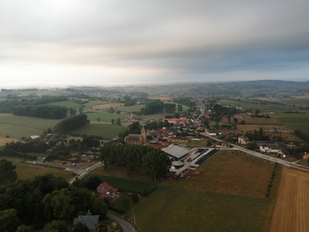 We stegen op vanaf onze weide hier achter de boerderij, in het hartje van Schorisse. Dat wou ik heel graag, omdat ik zo onze boerderij vanuit de lucht kon bewonderen. De wind zat perfect die zaterdagmorgen, een kalme zuidwestenwind. We gingen heel traag recht omhoog, en werden dan meegenomen door de wind. Voor een prachtige reis over Schorisse, Horebeke en Zwalm. De échte mooie Vlaamse Ardennen. Geniet zelf mee met enkele foto’s… Dat we vlogen bij zonsopgang maakte het bovendien helemaal feeëriek en idyllisch.