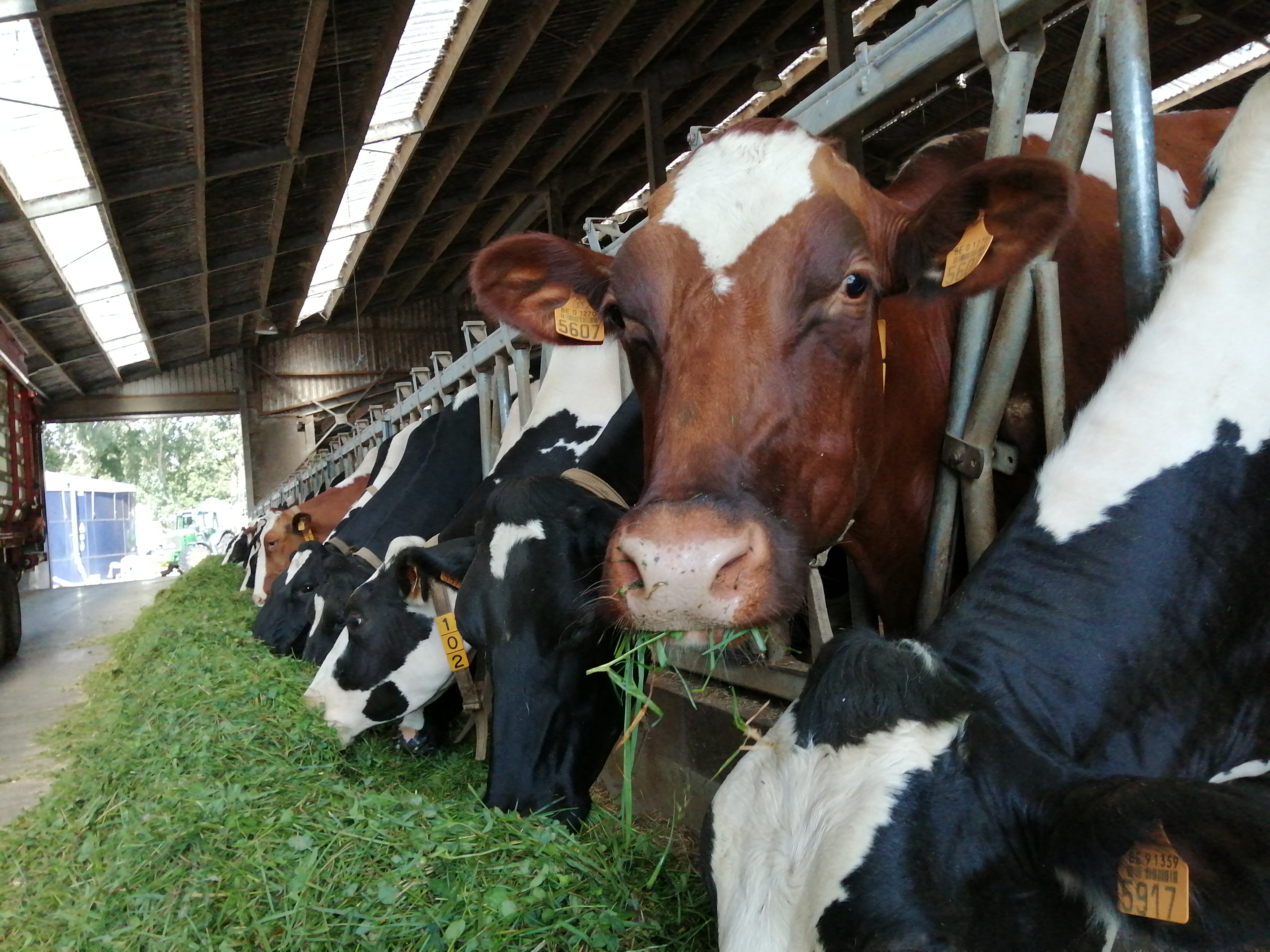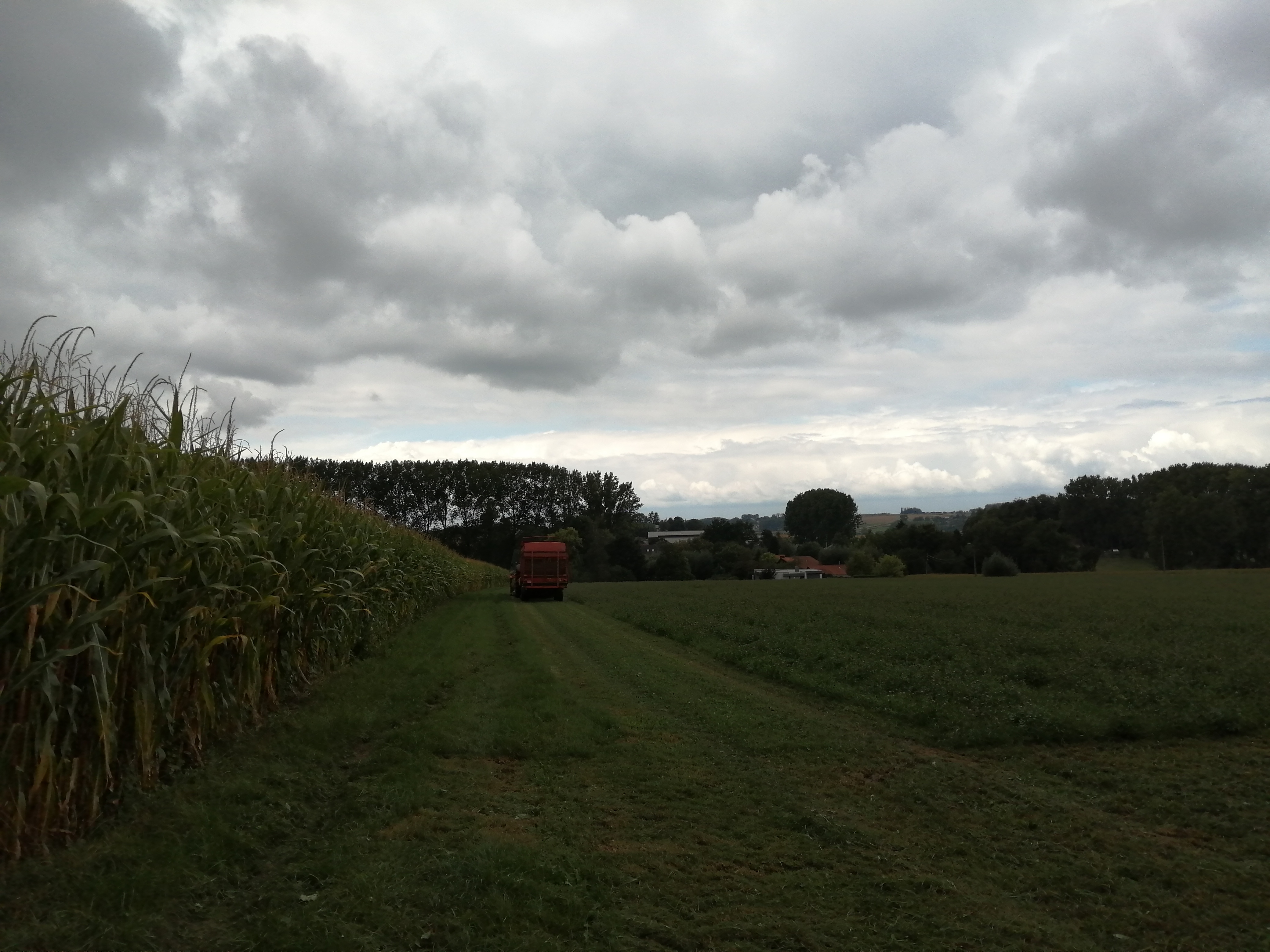 Het gras wordt weer gemaaid, maar ook de maïsoogst komt dichterbij. Hierboven links zie je een partij van onze maïs. In het midden van de foto zie je het dak van onze melkveestal piepen.