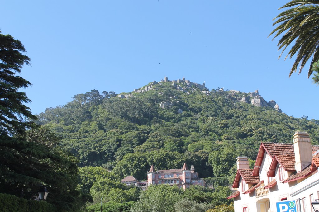Nu over Sintra… Wij arriveerden met de trein (rechtsboven op bovenstaande kaart) en kregen snel te zien (foto hieronder) wat er ons nog te wachten stond. Het Palácio da Pena (niet te zien op de foto) en daarvoor het Castelo dos Mouros liggen boven op een heuvel. Je kan er met de bus naartoe maar wij gingen er te voet heen!