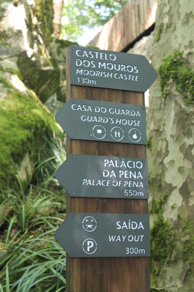 Ik weet eigenlijk niet precies hoeveel km het uiteindelijk is tot aan het Castelo dos Mouros of het Palácio da Pena. We kwamen wel op een splitsing, waaruit blijkt dat ze zo’n 800 meter uit elkaar liggen. Ik denk dat het een goeie 5 km is tot aan het paleis. Niet zo heel ver maar omdat het steeds omhoog is, doe je er wel langer over dan een uur. Het Palácio da Pena is gelegen op 450 meter hoogte boven de zeespiegel. Onderweg mag je zeker niet vergeten eens rond te kijken!